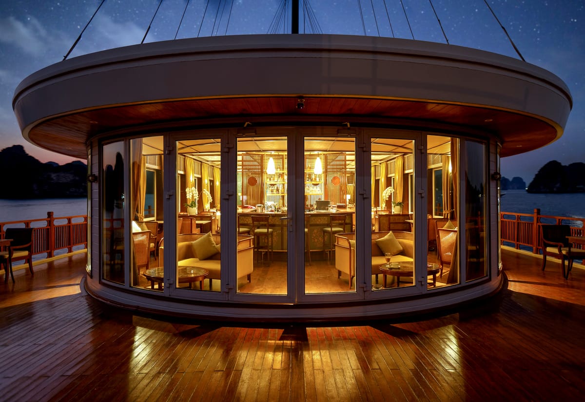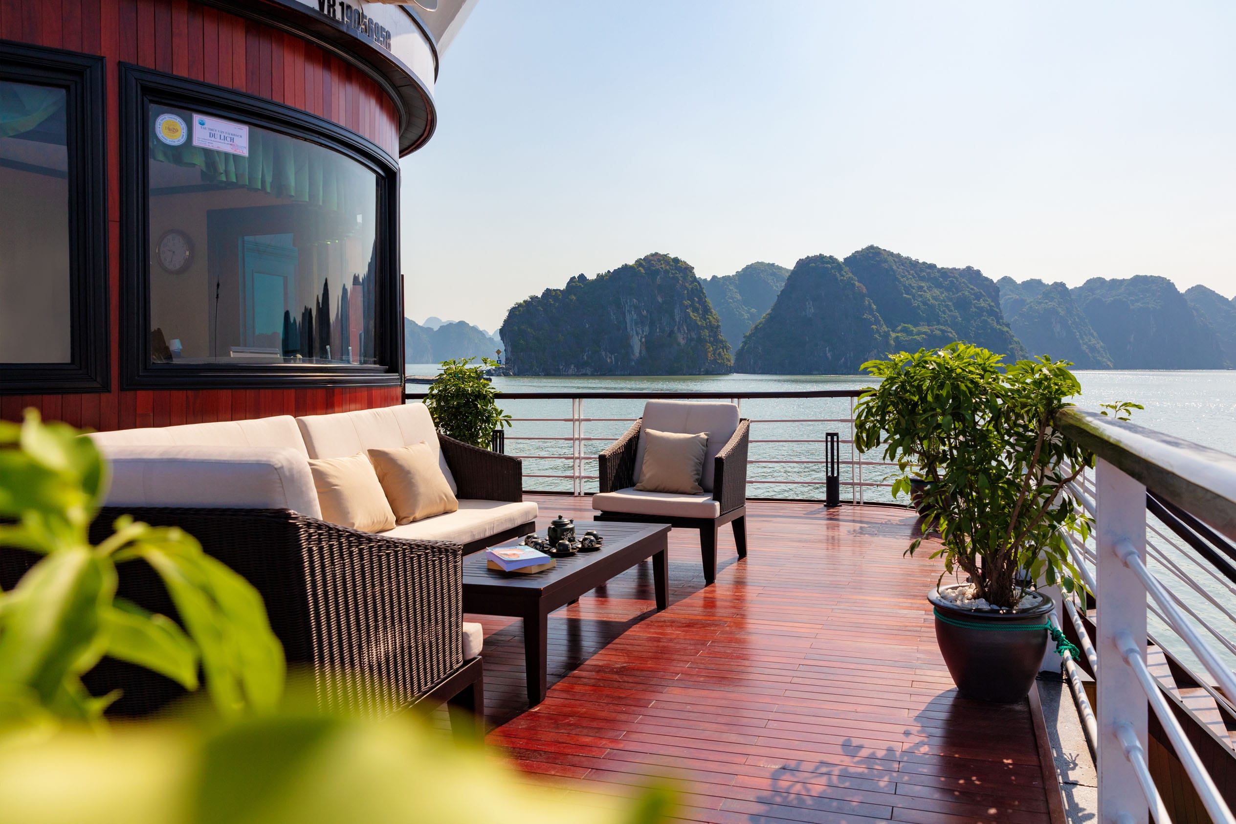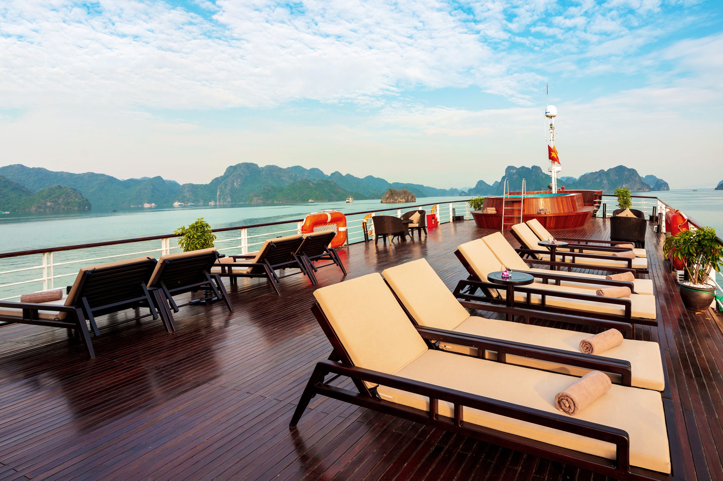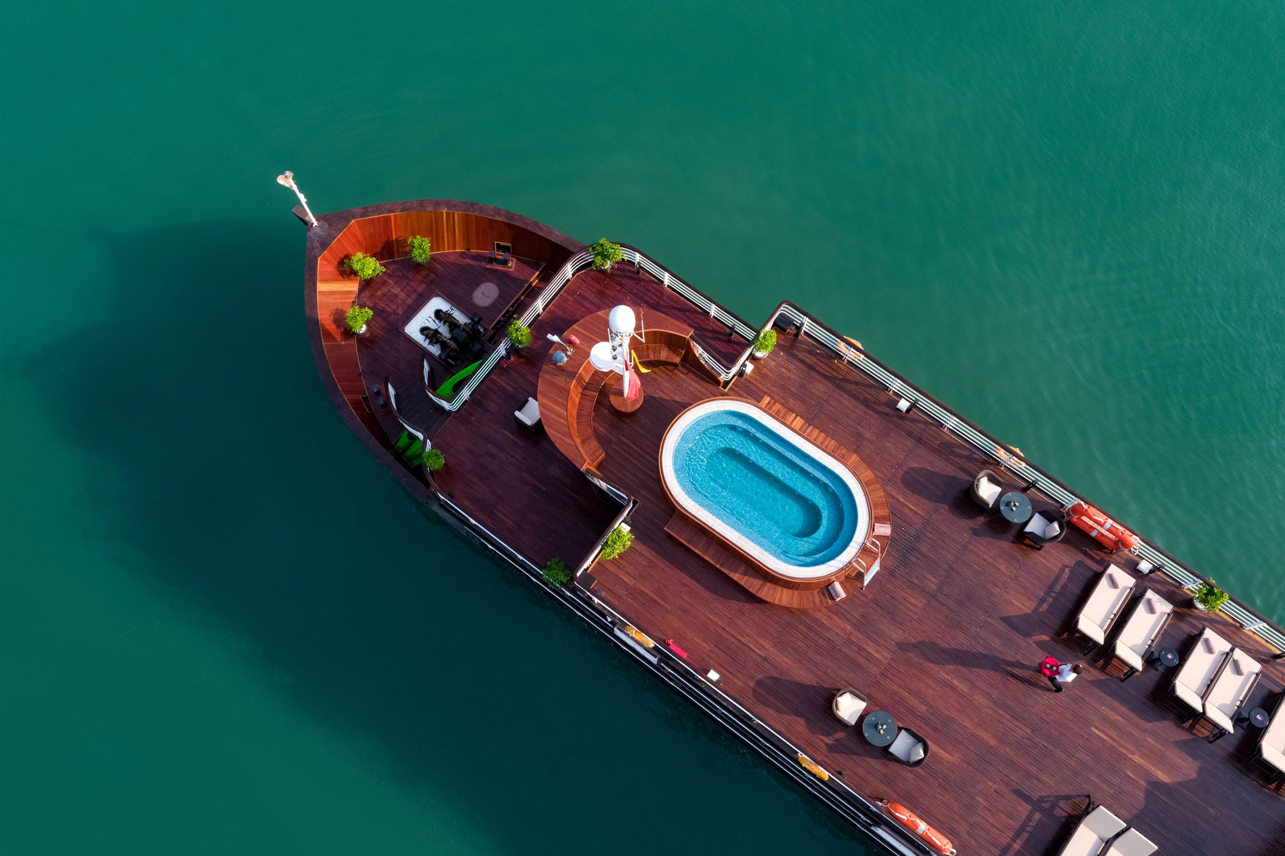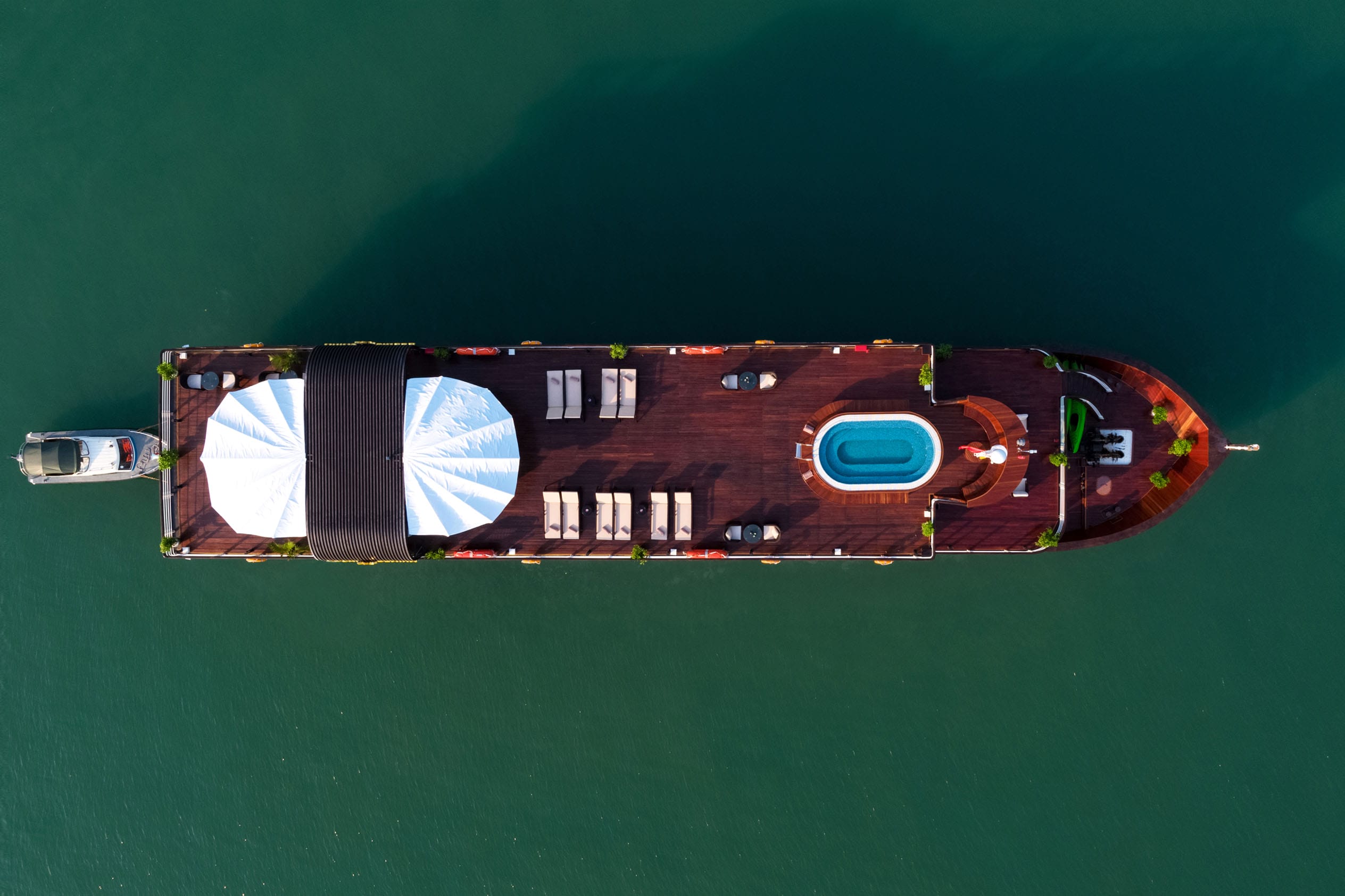No matter who you are, a first-timer on board or a returner with a heart for Halong Bay cruising, you will want to consider the below fresh-off-the-boat choices. The list here contains all newly operated cruises, which include on-site vessels that updated their service, facilities, and itinerary every year to meet guests’ requirements, and the recently built ships with up-to-date features and a new less-traveled route to add to the collection of top-rated cruises. At first glance, the newest cruises will promise a charming exterior and unique design, some even own amenities such as a Jacuzzi, sauna, or mini-golf course. However, do not forget the activities stored in their sleeves, exploring the new caves and karst formations, visiting new places off the map, and joining fusion cooking classes, for example. Have you made up your mind yet? Let us help you.