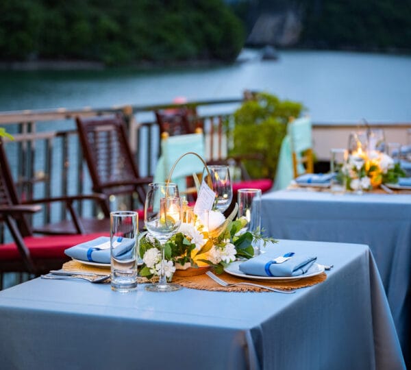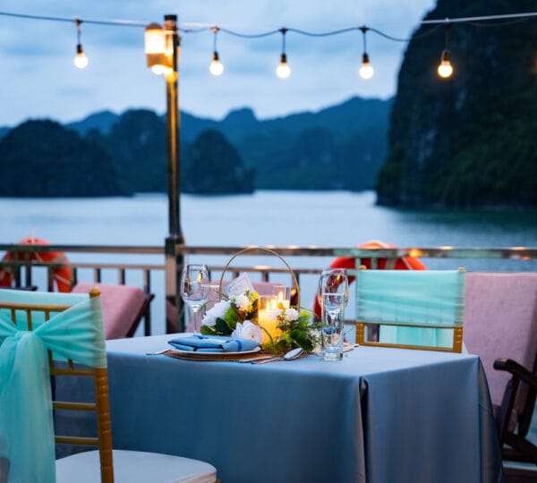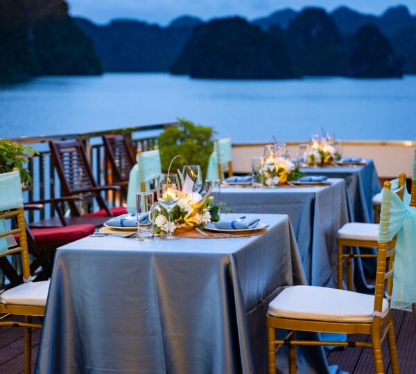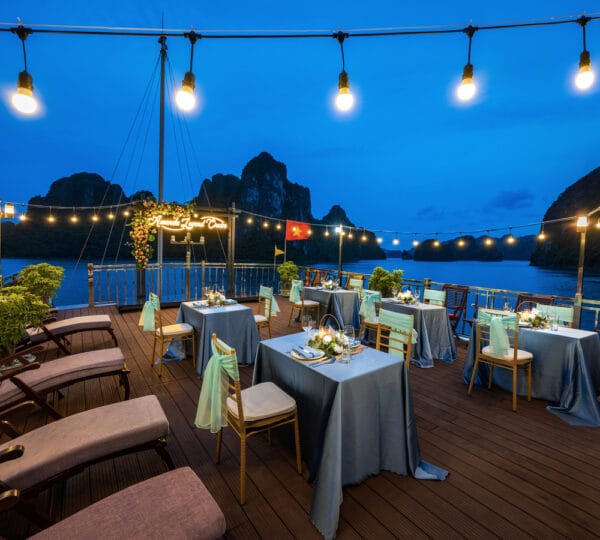 20:30 After dinner, you will enjoy a peaceful view of the Bay at night on the deck. You can also participate in evening activities such as massage (subject to additional charge), herbal foot bath in your room (free of charge), fashion show traditional costumes “Footsteps of Heritage” and some drinks at Sky Bar while admiring the breathtaking view of the Bay at night and squid fishing. The ship is anchored in a quiet area at Bai Tu Long Bay.