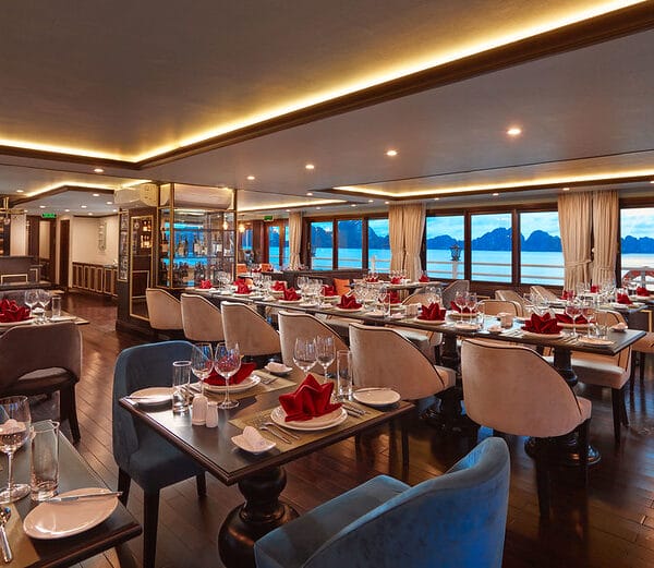 12:45 HAPPY LUNCH: Lunch is served at our cozy restaurant. As the cruise departs towards Halong Bay-a natural wonder of the world, absorb yourself in the gorgeous scenery and famous sights of limestone