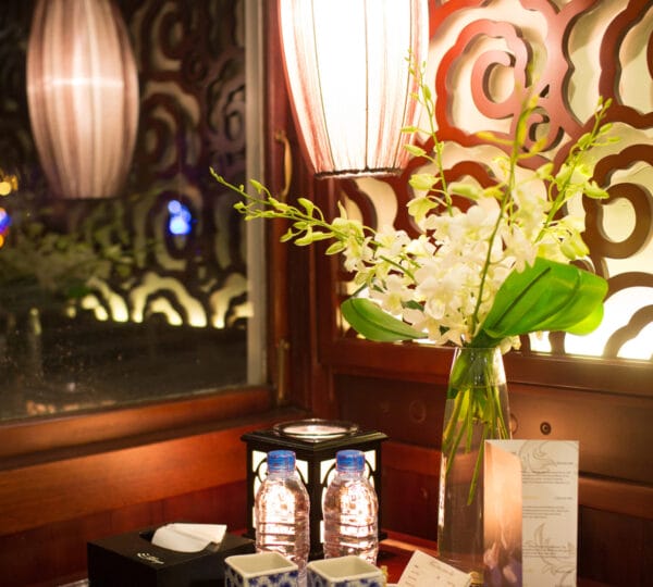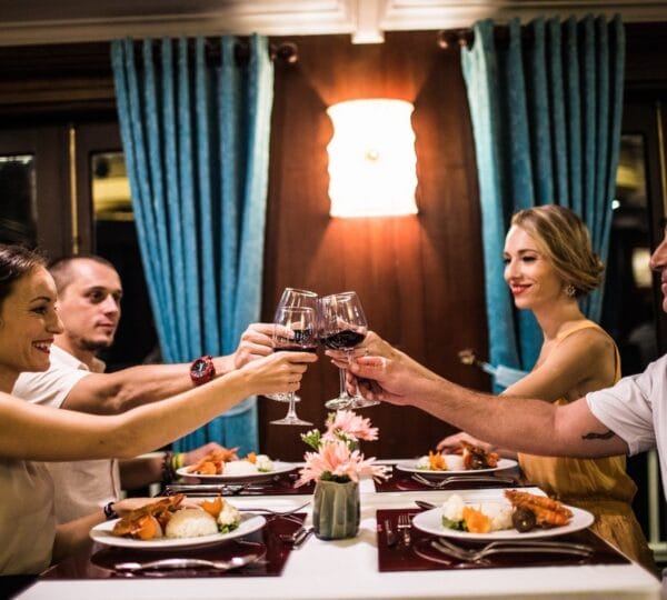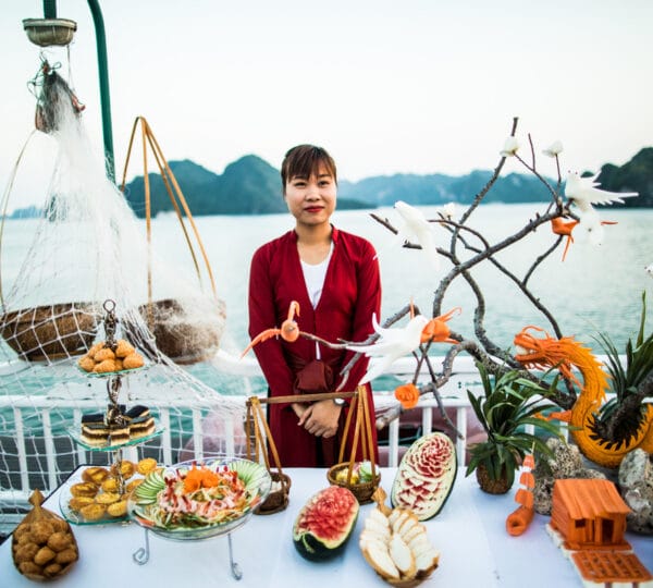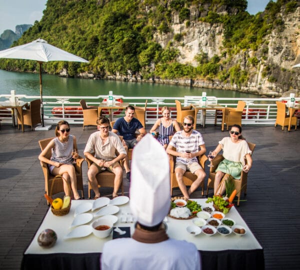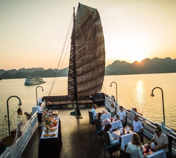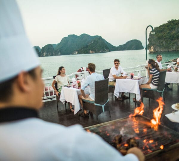 17:30 Bar opens for a Happy Hour promotion. Join the exciting cooking demonstration making the signature Vietnamese spring rolls. Don’t miss out on the stunning sunset over the enchanting Halong Bay from the sundeck.