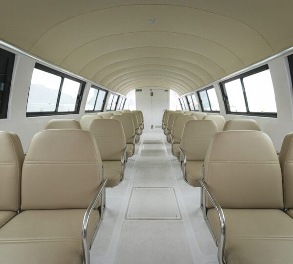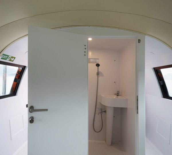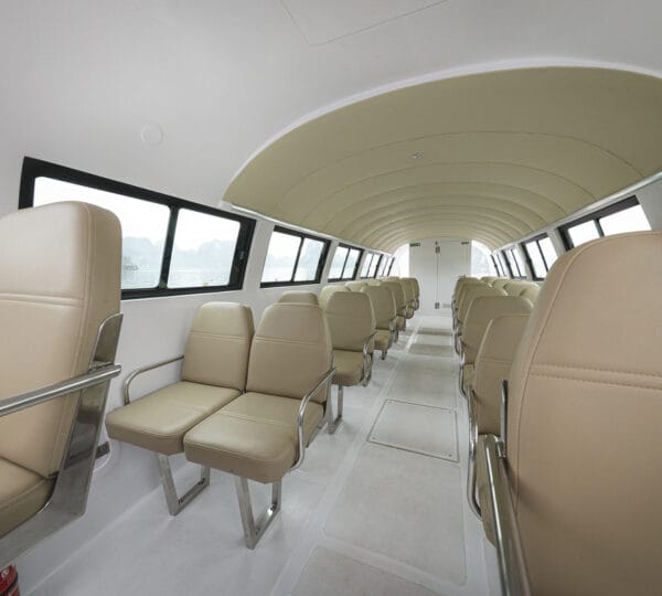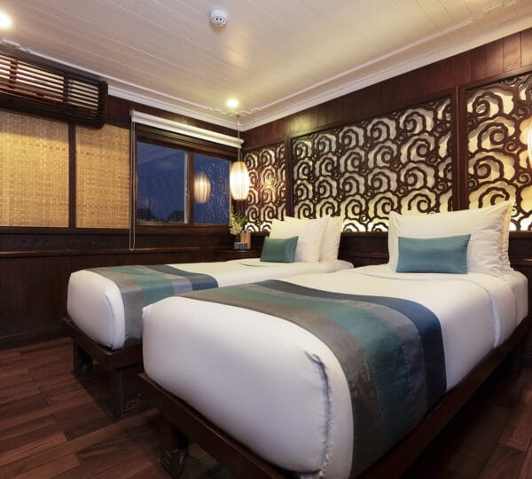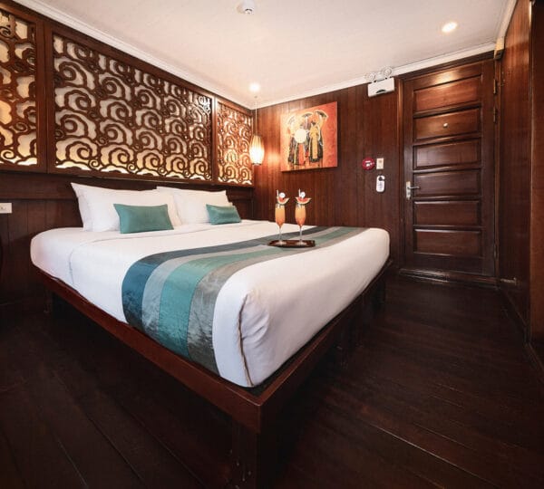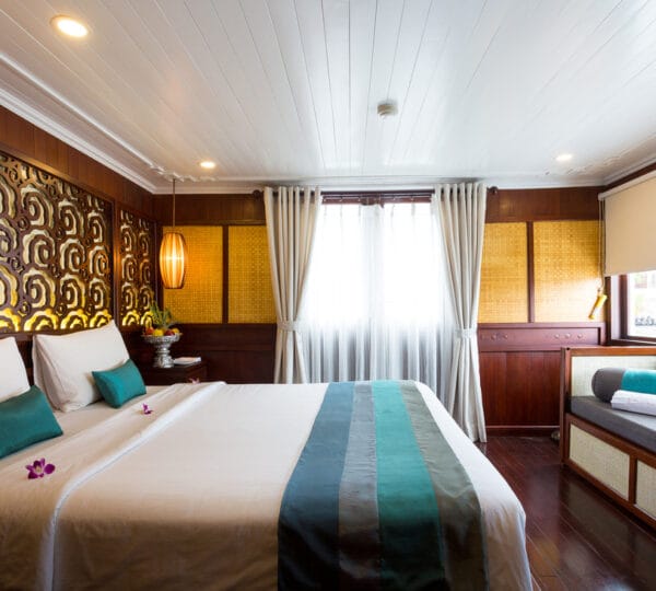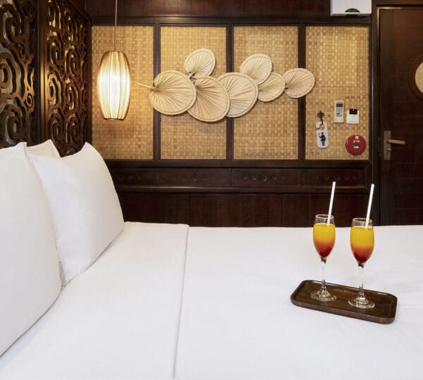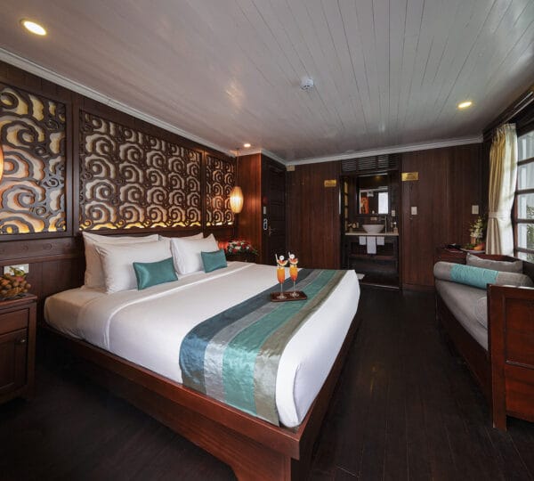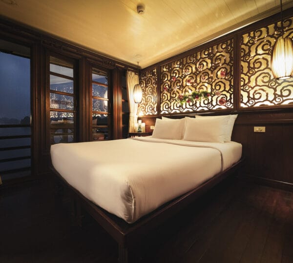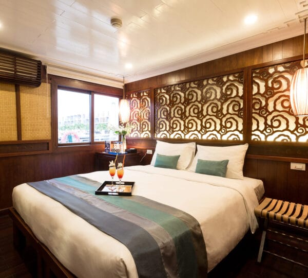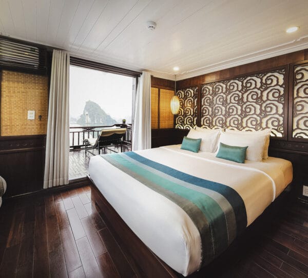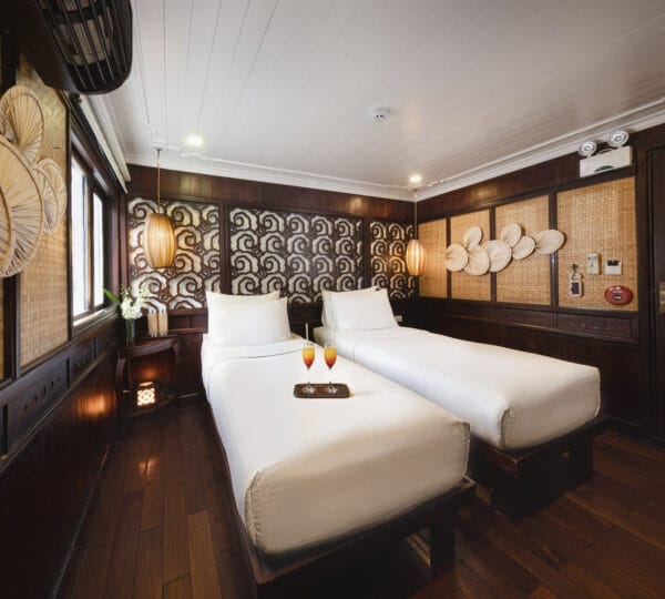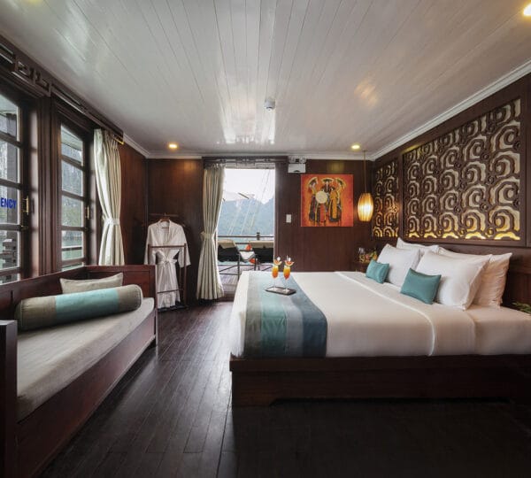 The cruise itinerary highlights some of the bay’s most iconic sites, including Chicken Rock, Finger Islet, and Frog Islet. Guests will have the opportunity to explore Luon Cave, Trinh Nu Cave, and Cua Van Floating Fishing Village by rowing boats, enhancing their experience of the stunning surroundings.