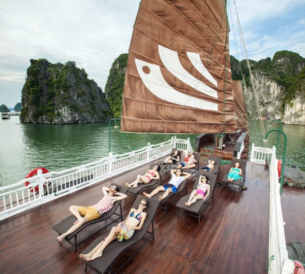 14:00 Enjoy the afternoon at leisure watching the magnificent seascape as the boat slowly cruises towards the center of Halong Bay.