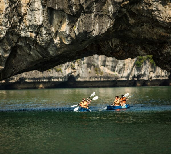 15:00 Explore the Trinh Nu area by kayak and experience the awe-inspiring beauty of nature, navigating through the rugged mountains rising from the emerald waters.