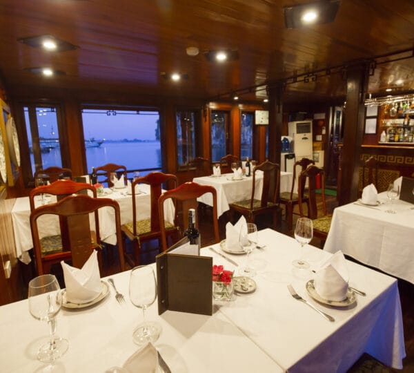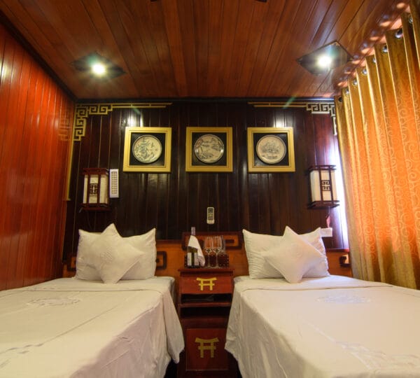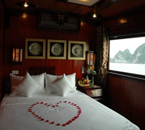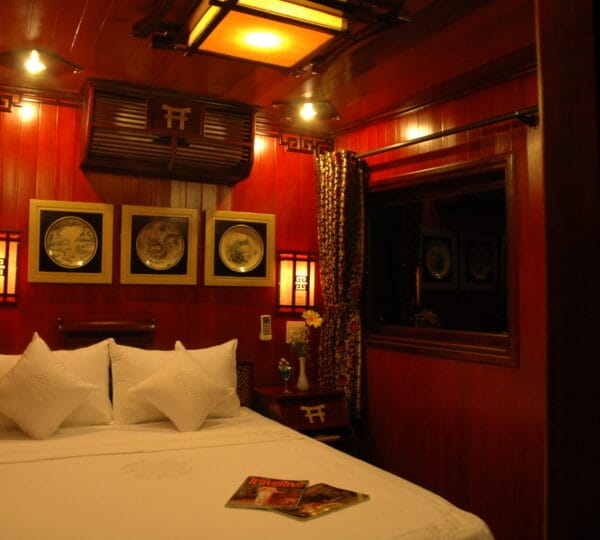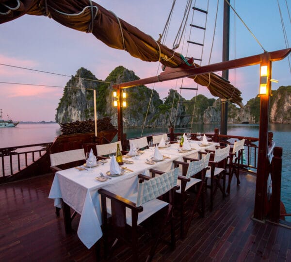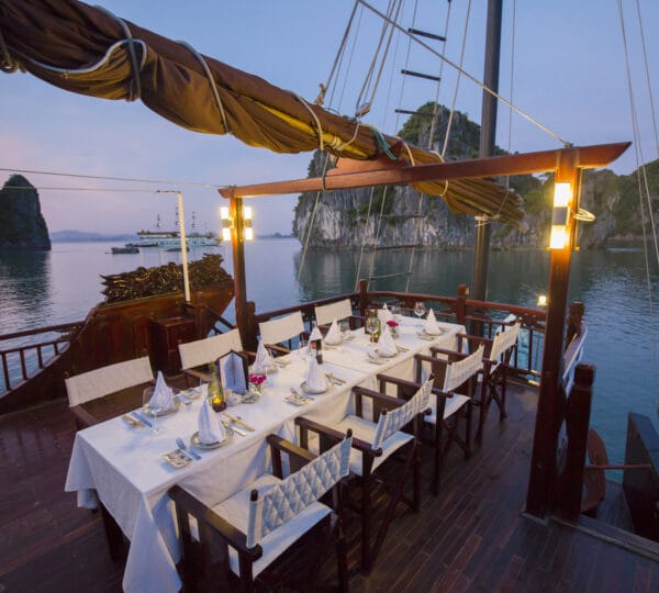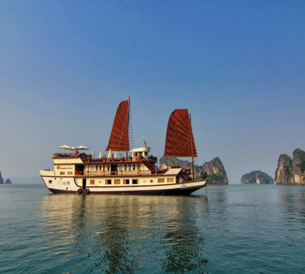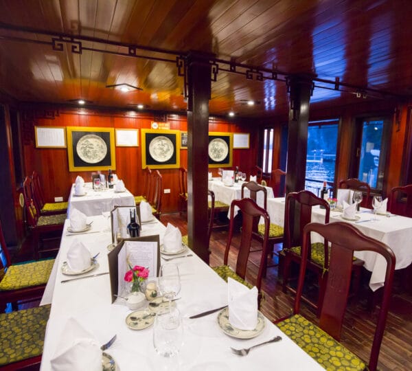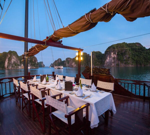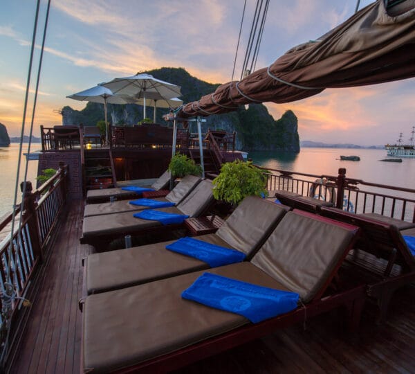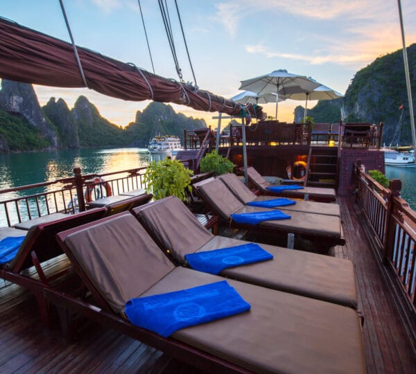 Built in 2010, Dragon Pearl Junk has remained on the top recommendation list of Ha Long Bay cruise. It features 11 cabins, each measuring 12 sqm. These cabins are elegantly designed with fine woodwork and detailed interior decoration. The common area can accommodate up to 36 guests, making it ideal for those eager to explore Ha Long Bay. The sundeck provides a perfect spot for taking photos, watching sunsets, or simply relaxing.