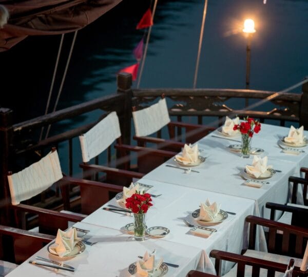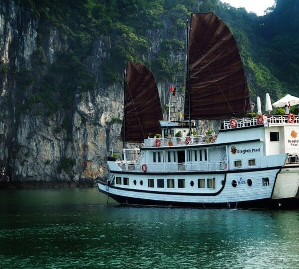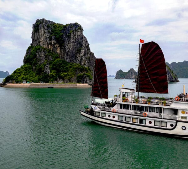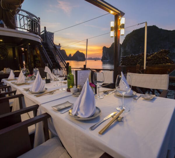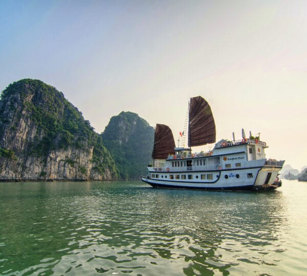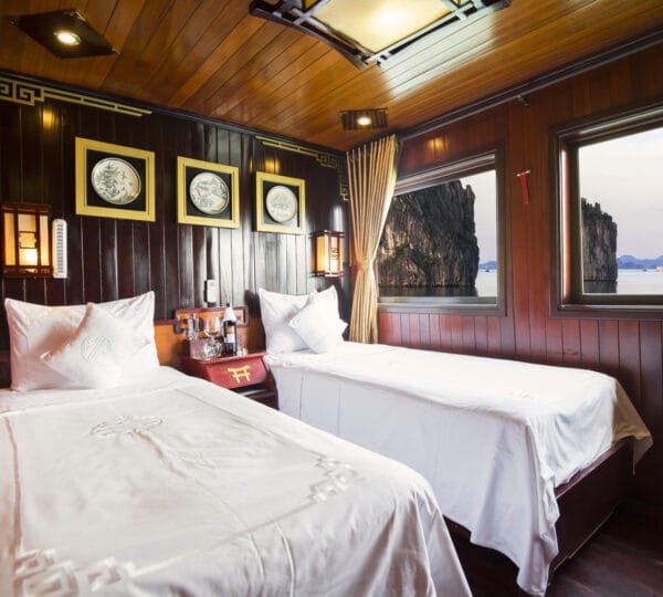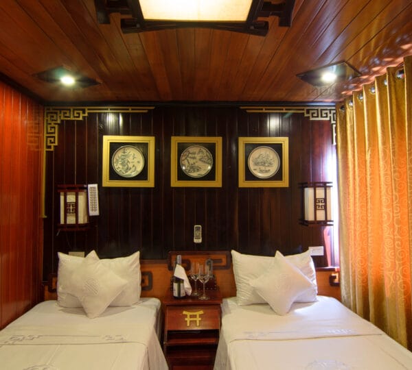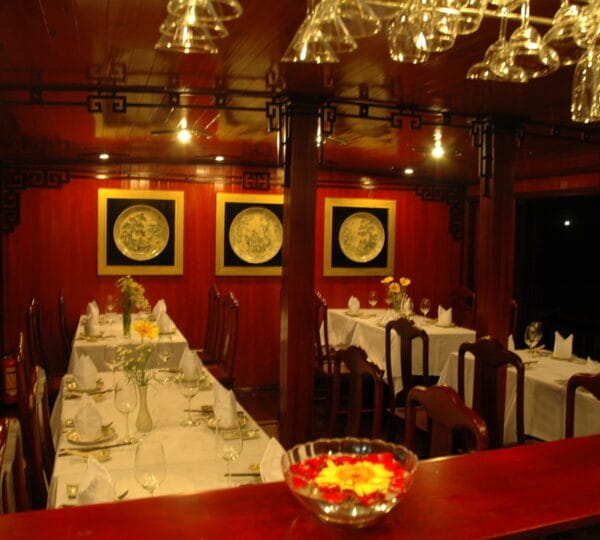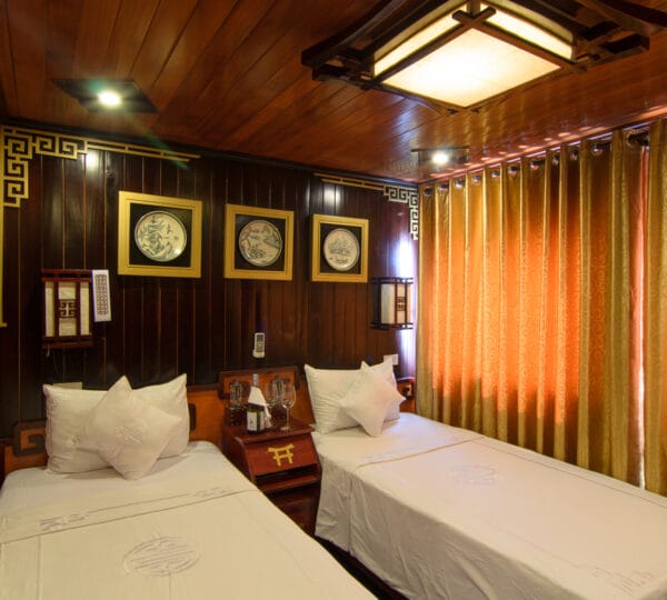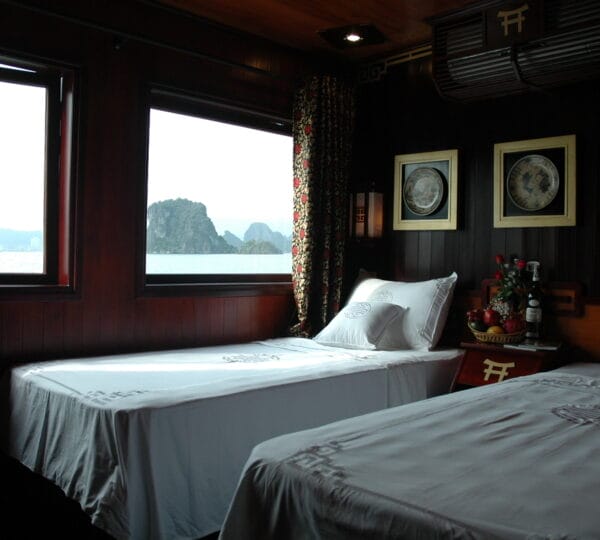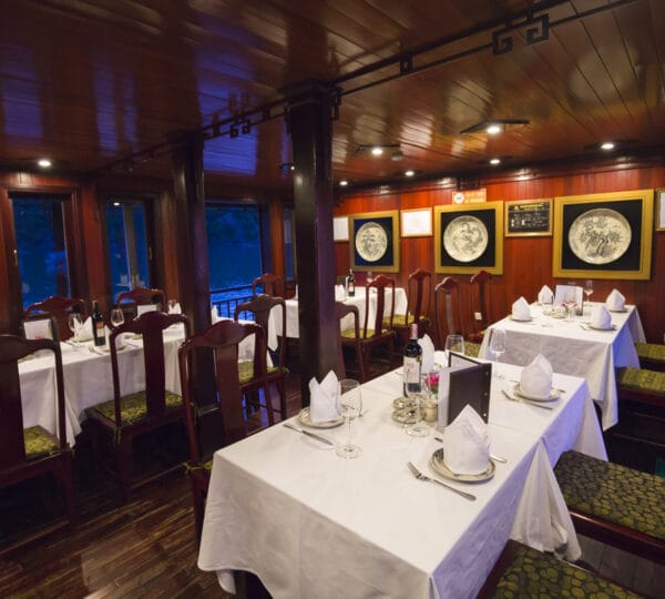 Built in 2010, Dragon Pearl Junk has remained on the top recommendation list of Ha Long Bay cruise. It features 11 cabins, each measuring 12 sqm. These cabins are elegantly designed with fine woodwork and detailed interior decoration. The common area can accommodate up to 36 guests, making it ideal for those eager to explore Ha Long Bay. The sundeck provides a perfect spot for taking photos, watching sunsets, or simply relaxing.