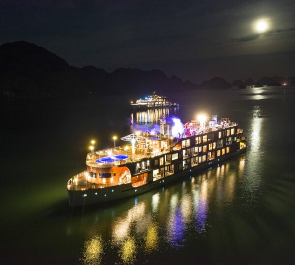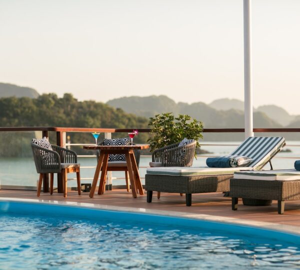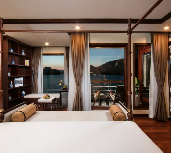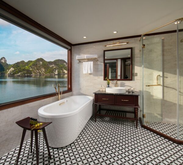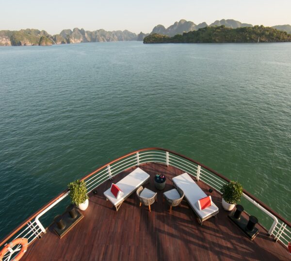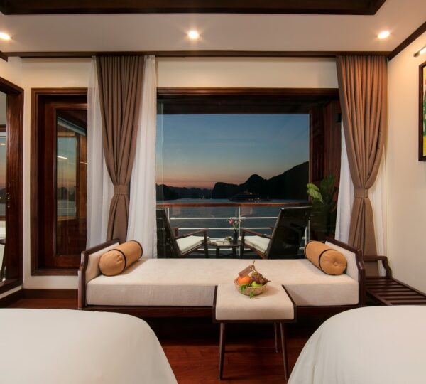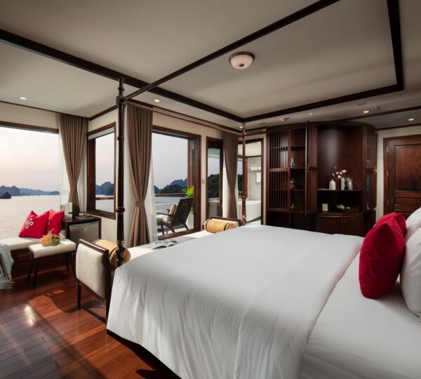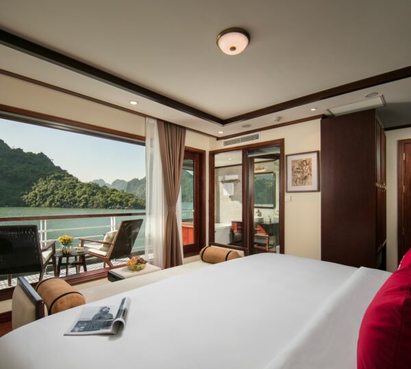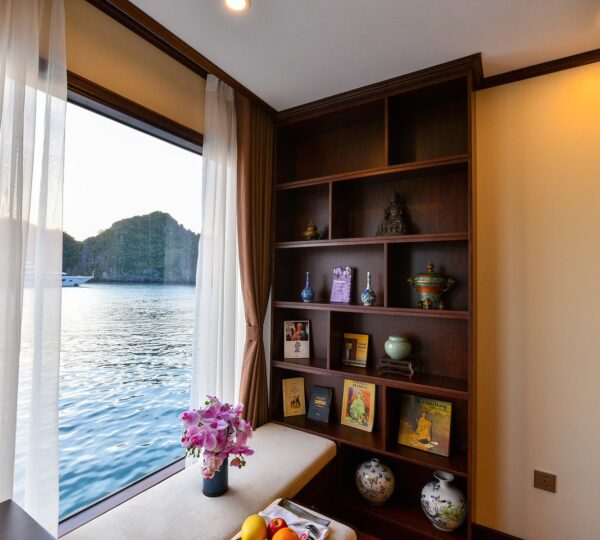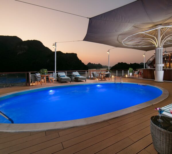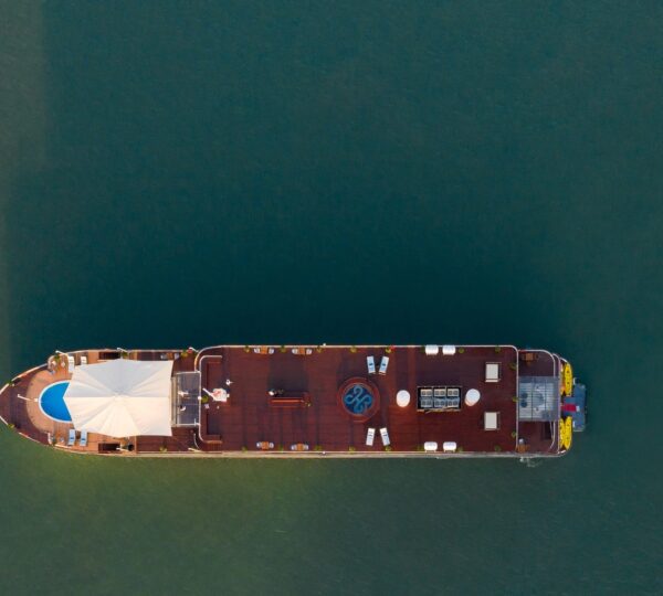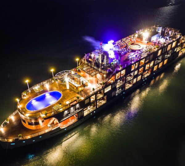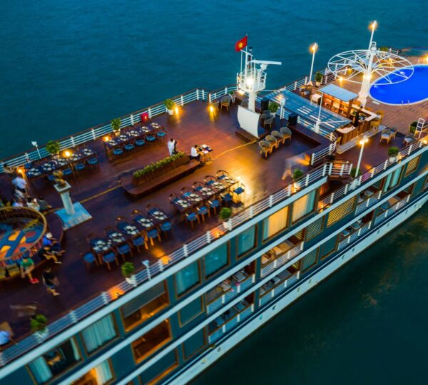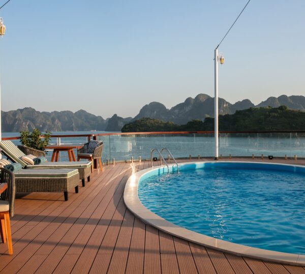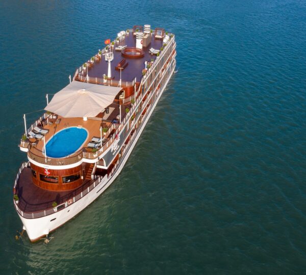 The cruise features 20 boutique cabins. Each spacious cabin, ranging from 33 to 46 square meters, showcases Vietnam’s heritage design and comes equipped with high-end amenities. All cabins include a private balcony and floor-to-ceiling windows to enhance the views. Guests can enjoy a variety of leisure activities onboard, including an outdoor pool on the third deck, a library, a piano lounge, an art exhibition, onboard shops, a poolside bar, a spa, and a gym. With a wide range of onboard and outdoor activities, this cruise is ready to bring a memorable cultural experience to you.
