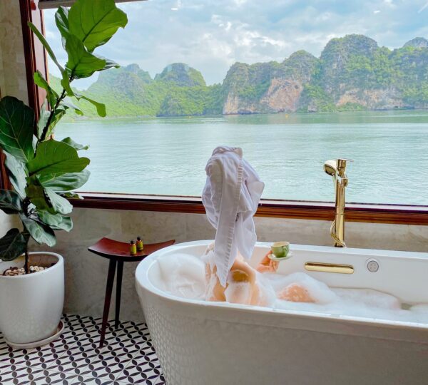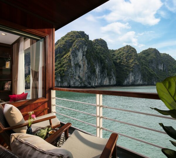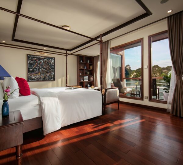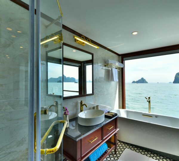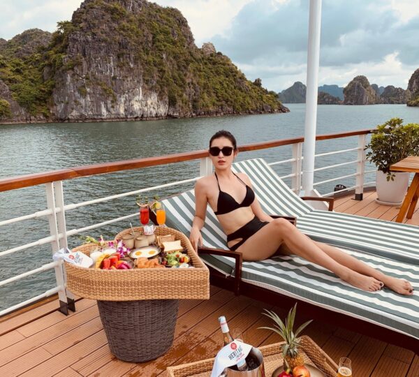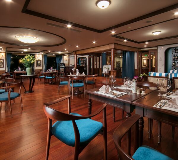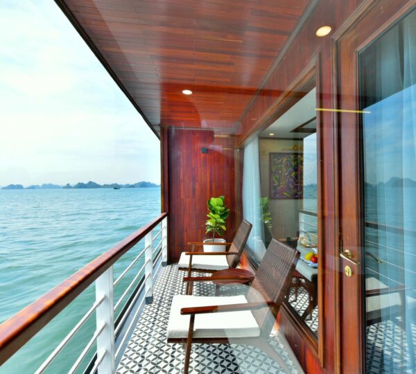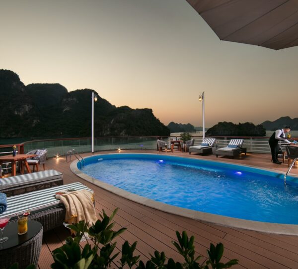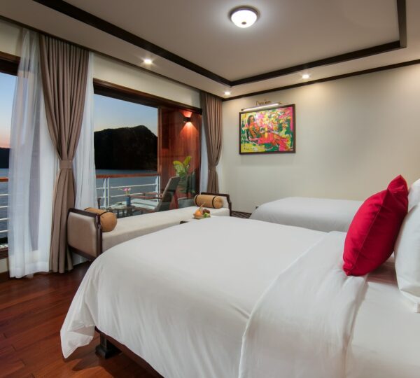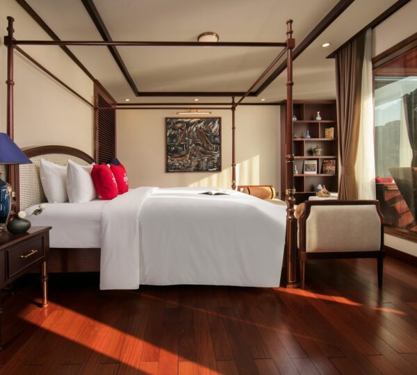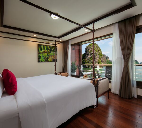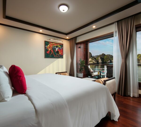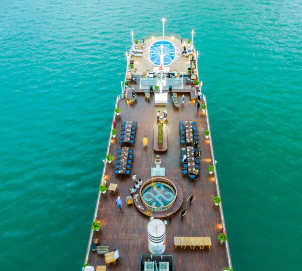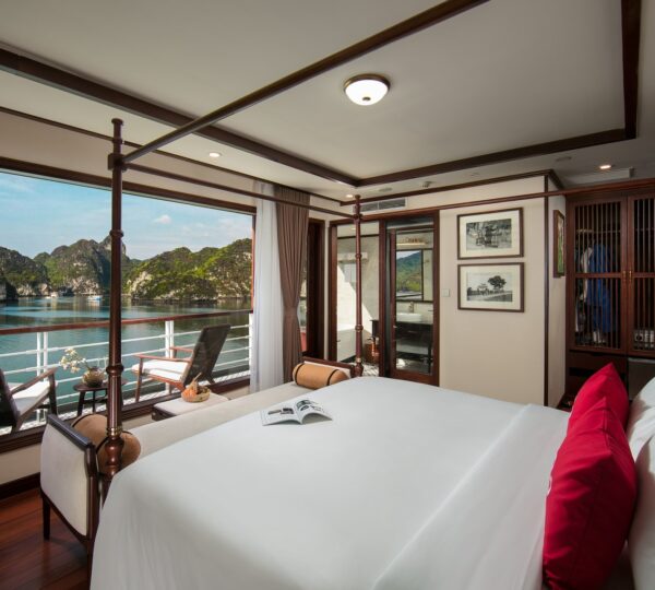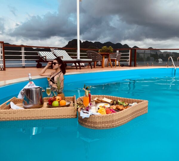 The cruise features 20 boutique cabins. Each spacious cabin, ranging from 33 to 46 square meters, showcases Vietnam’s heritage design and comes equipped with high-end amenities. All cabins include a private balcony and floor-to-ceiling windows to enhance the views. Guests can enjoy a variety of leisure activities onboard, including an outdoor pool on the third deck, a library, a piano lounge, an art exhibition, onboard shops, a poolside bar, a spa, and a gym. With a wide range of onboard and outdoor activities, this cruise is ready to bring a memorable cultural experience to you.