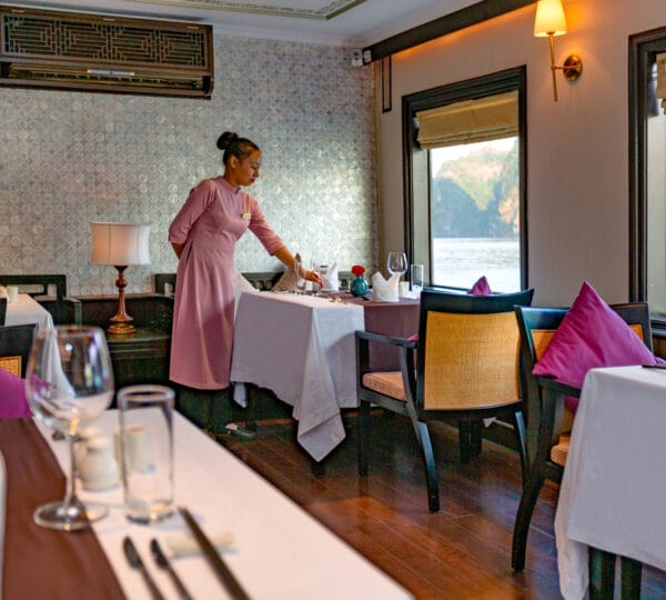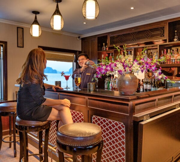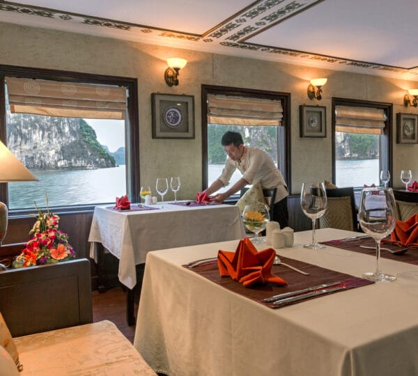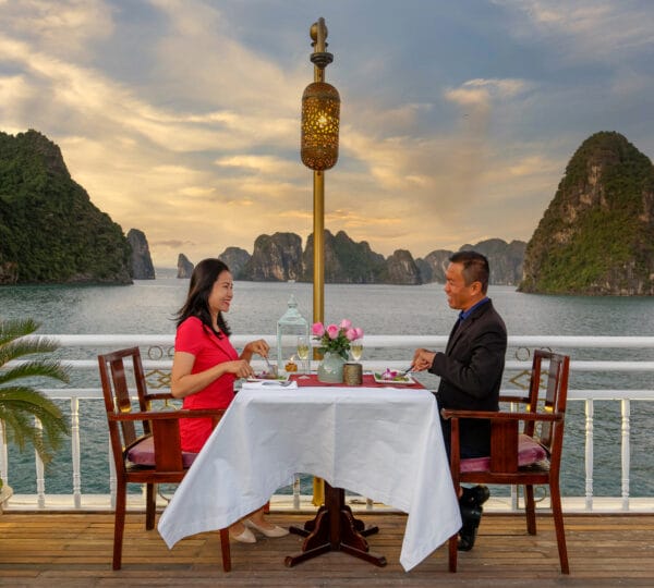 As evening descends, a multi-course ? la carte dinner is served. If you like, join in later for an onboard presentation about the bay’s unique features and secrets. Alternatively, try your hand at squid fishing with our staff for a delightful and entertaining experience. Spend the rest of the evening embracing the magical landscapes in the heart of Halong Bay, where once upon a time, sparkling jewels cascaded from heavenly dragons.
