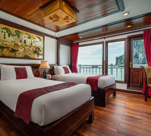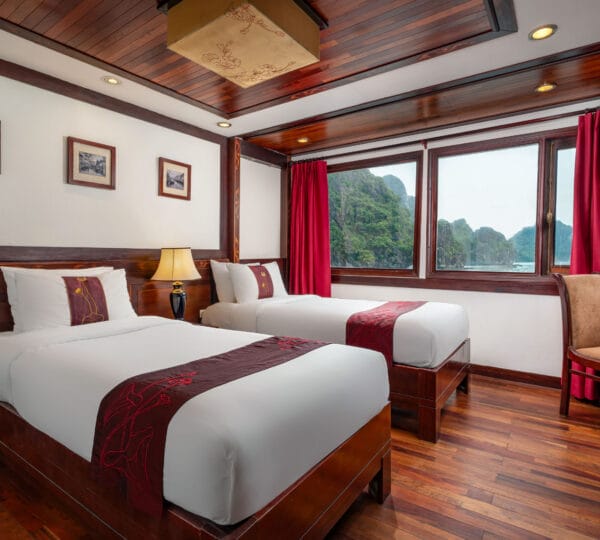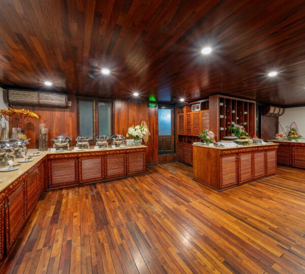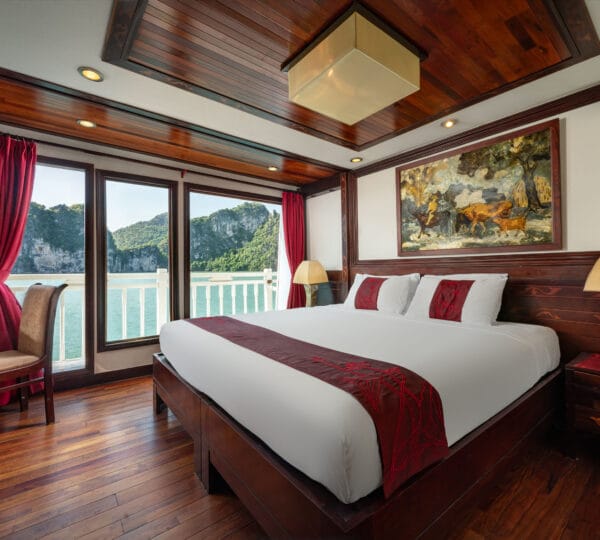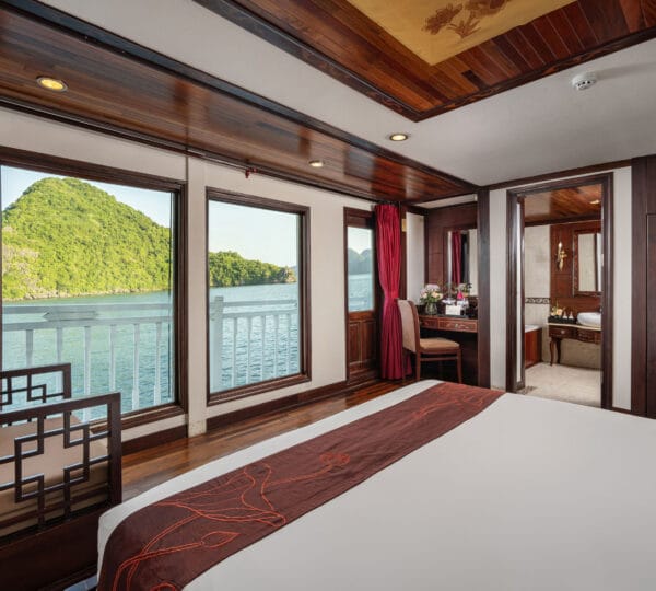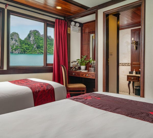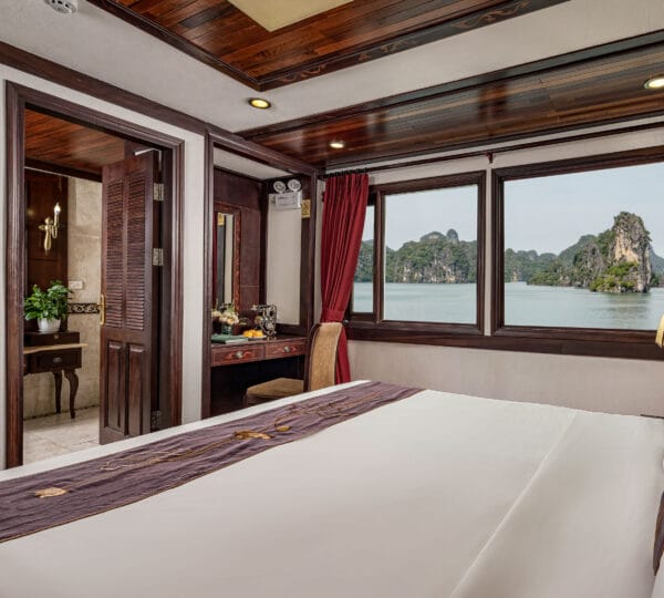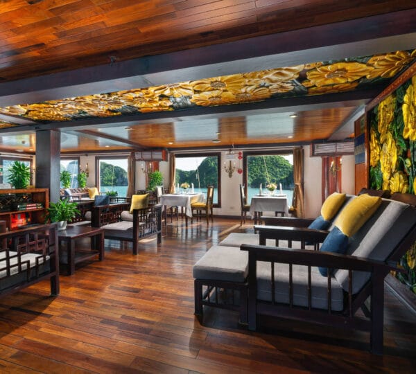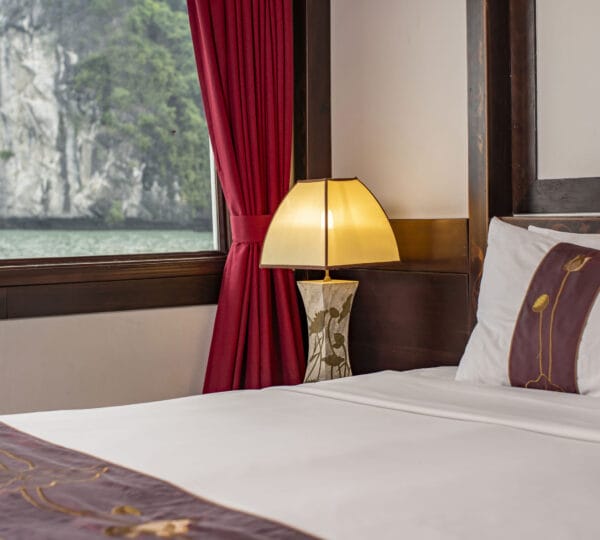 The cruise features 23 cozy cabins, each up to 20 sqm, designed with a traditional flair yet equipped with contemporary comforts. Cabins are categorized into Superior, Deluxe, Suite, and President Suite, ensuring a range of options to meet different preferences. Indochina Sails offers a range of delightful experiences, including a spacious sundeck perfect for outdoor BBQs and Tai Chi classes to start the day refreshed. Guests can enjoy elegant dining with authentic Vietnamese and international buffets, sip fine wines at the international bar, and take part in a variety of onboard activities such as kayaking and spa treatments. Discover attractions such as Bai Tu Long Bay, Cua Van Fishing Village, and Titop Island with Indochina Sails Cruise. This cruise is the best choice for families traveling with children.