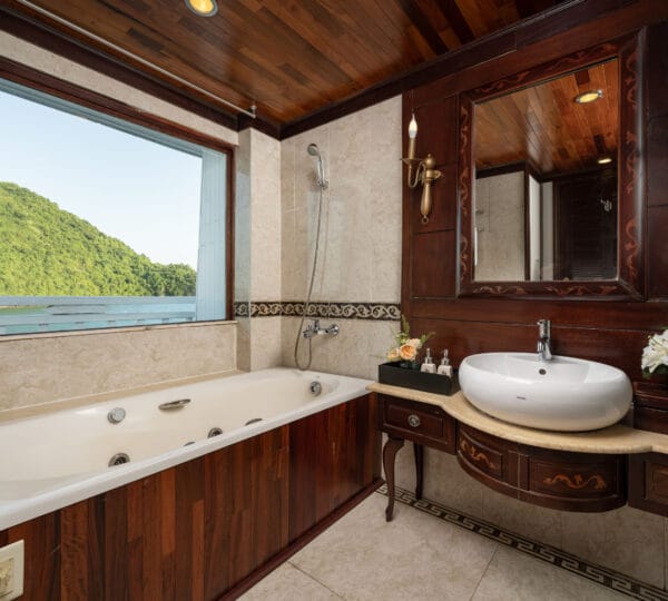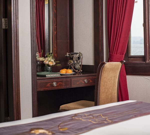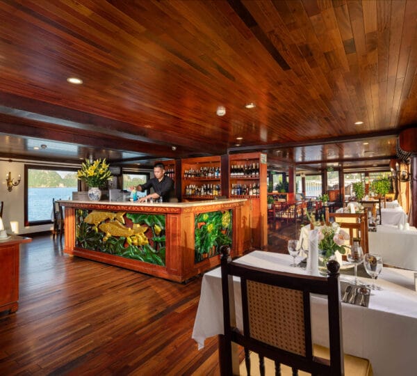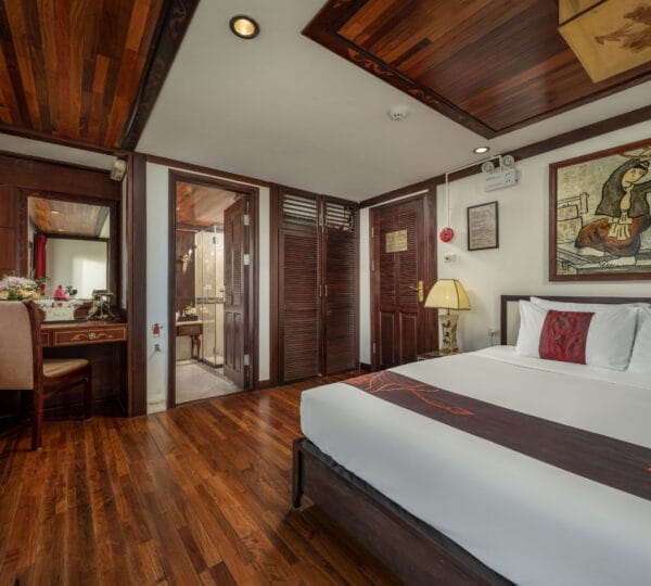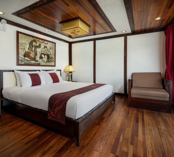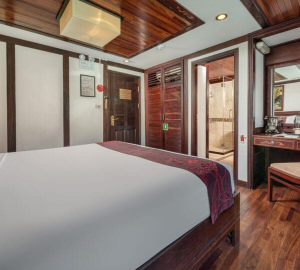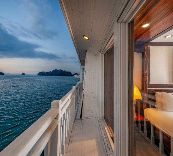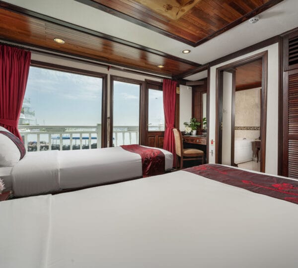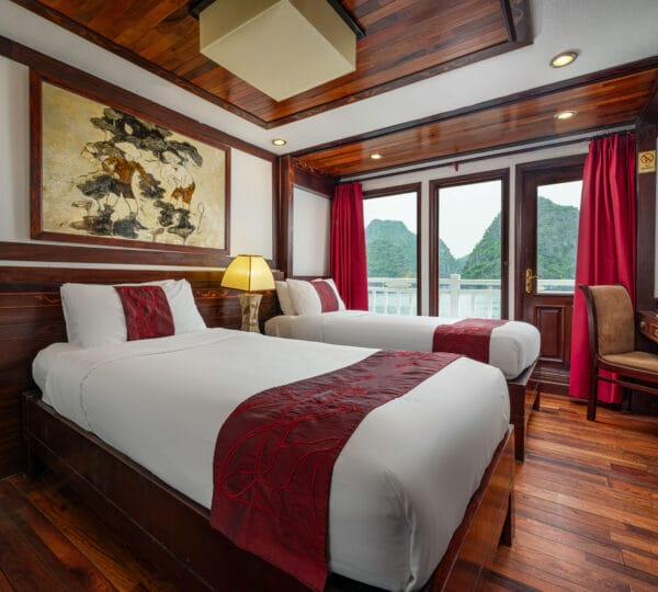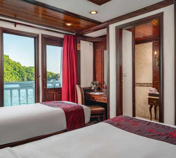 The cruise features 23 cozy cabins, each up to 20 sqm, designed with a traditional flair yet equipped with contemporary comforts. Cabins are categorized into Superior, Deluxe, Suite, and President Suite, ensuring a range of options to meet different preferences. Indochina Sails offers a range of delightful experiences, including a spacious sundeck perfect for outdoor BBQs and Tai Chi classes to start the day refreshed. Guests can enjoy elegant dining with authentic Vietnamese and international buffets, sip fine wines at the international bar, and take part in a variety of onboard activities such as kayaking and spa treatments. Discover attractions such as Bai Tu Long Bay, Cua Van Fishing Village, and Titop Island with Indochina Sails Cruise. This cruise is the best choice for families traveling with children.