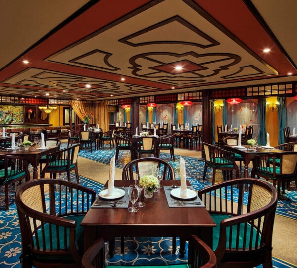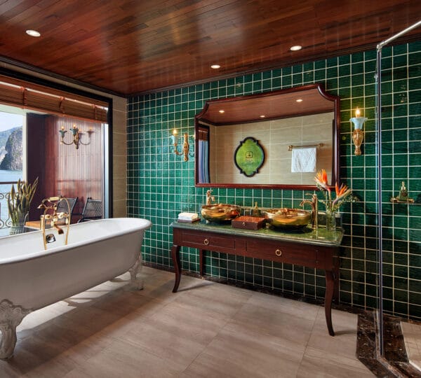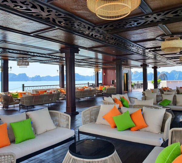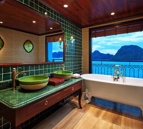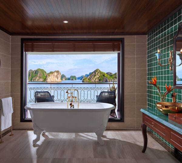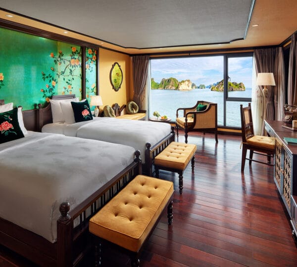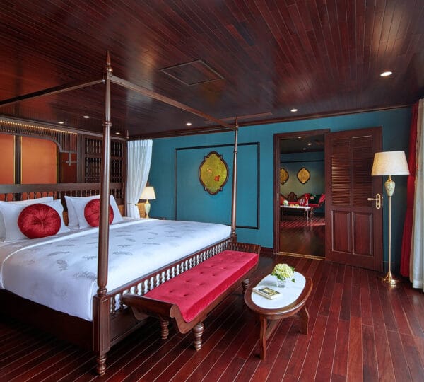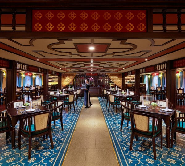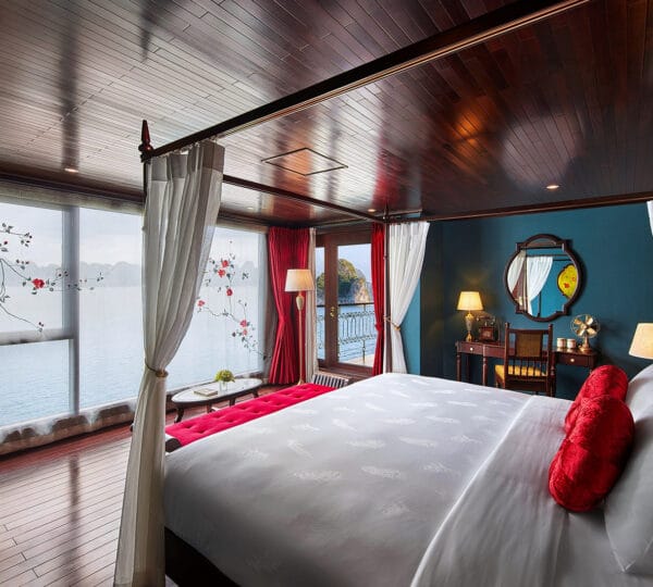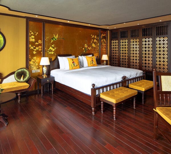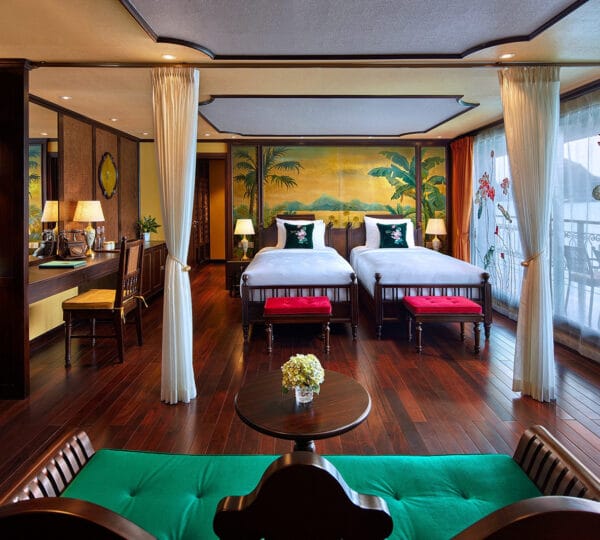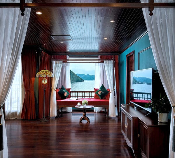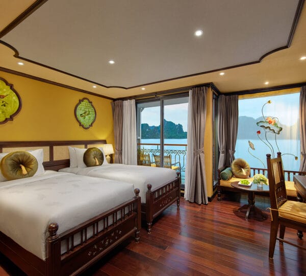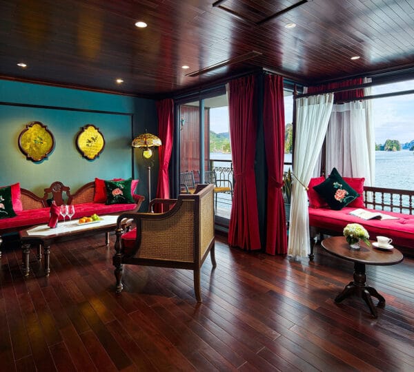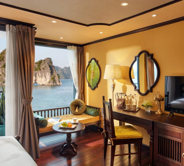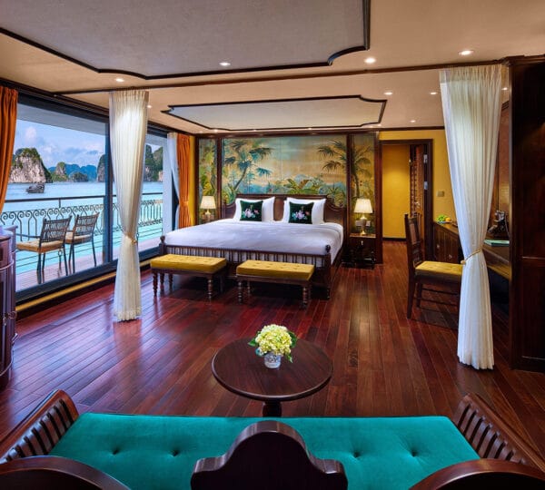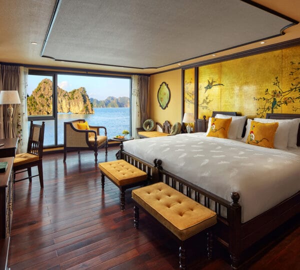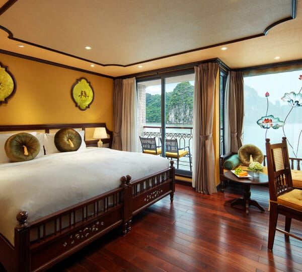 This vessel boasts 37 elegantly decorated cabins, each showcasing warm-toned colors and sophisticated Indochine decor. The suites come in a wide range of sizes from 34 to over 100 sqm. These spacious cabins include private balconies with stunning bay views, ensuite bathrooms, comfortable sofas, worktables, and natural wood wardrobes, offering a blend of comfort and style.