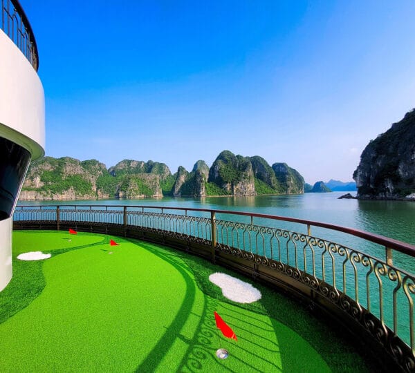 Onboard, guests can enjoy a range of luxury amenities, including a golf course, a wine and cigar cellar, a kids’ club, and a swimming pool. The culinary experience is exceptional, with a 250 sqm restaurant offering a diverse selection of Vietnamese and international dishes through a buffet, catering to all tastes. The cruise takes travelers to Luon Cave and Surprise Cave – the largest cave in Ha Long Bay. Book Indochine Premium to explore the charming nature and culture of Vietnam while enjoying international standard high-end with your family and friends.
