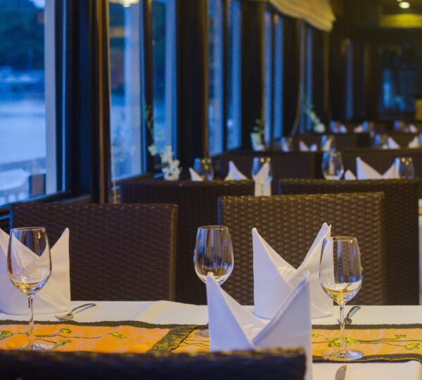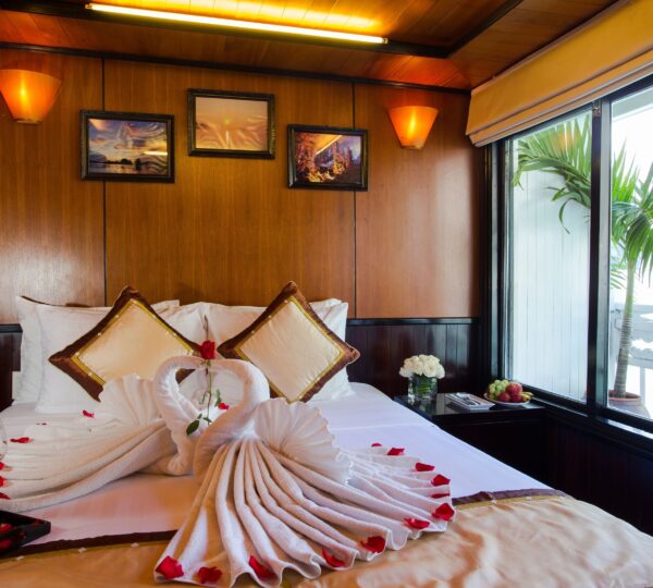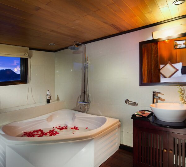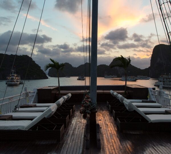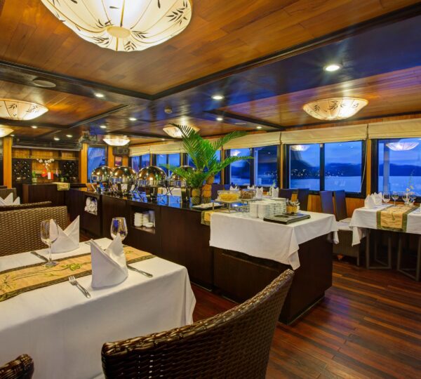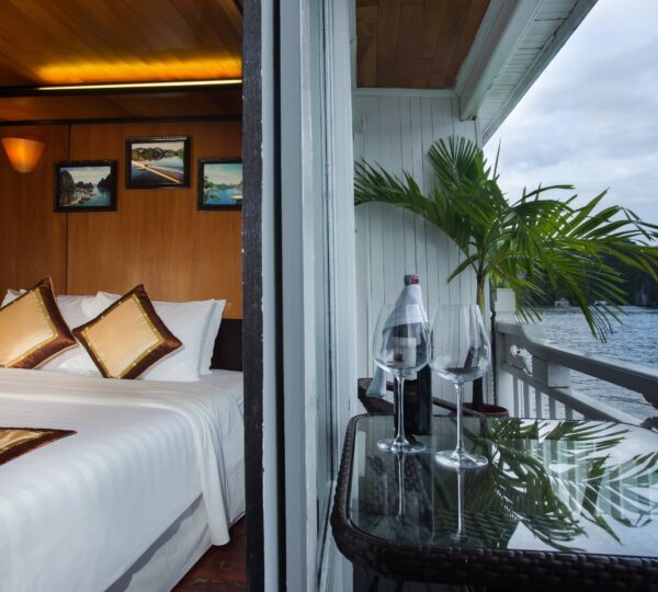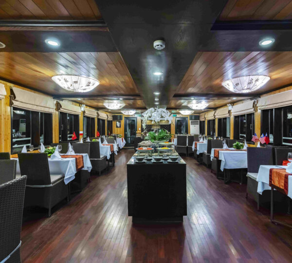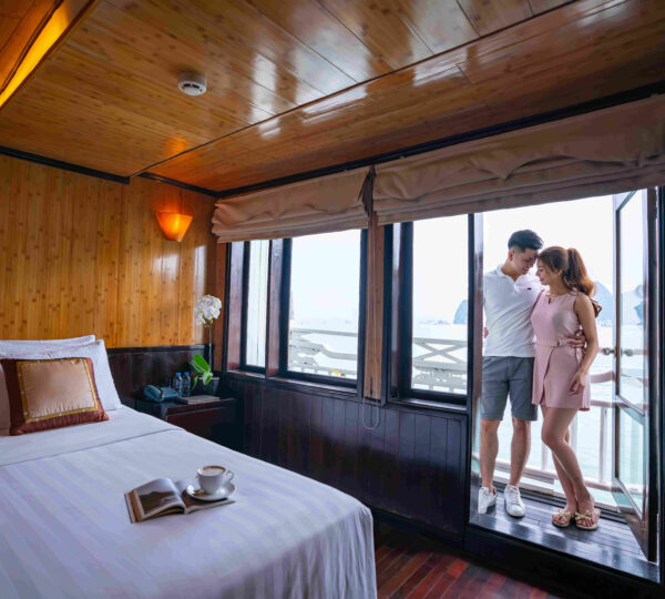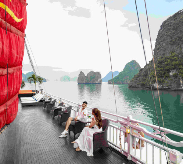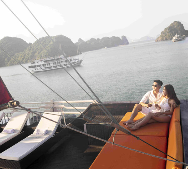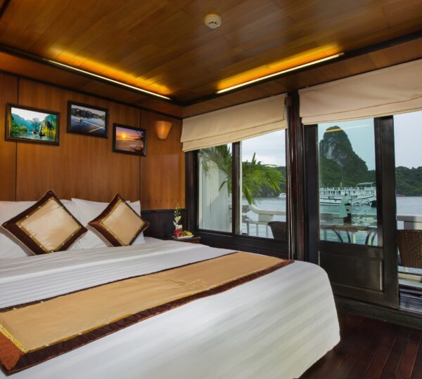 With 18 spacious deluxe cabins ranging from 35 to 55 square meters, each room is equipped with modern amenities including self-controlled air-conditioning, a safe, mini bar, wardrobe, and an ensuite bathroom. For those who seek privacy and relaxation, enjoy your own balcony with a sitting area ? perfect for unwinding. Guests can lounge on sunbeds and soak in the beauty of Lan Ha Bay while experiencing exquisite local and fusion dishes at the cruise restaurant, complemented by a fully stocked bar serving refreshing drinks.