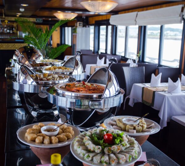 Enjoy delicious local food prepared and served for you by our wonderful onboard catering staff, night view on Lan Ha Bay is incredible.