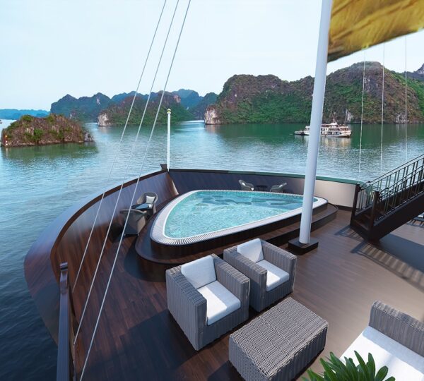 As you embark on this luxurious journey, enjoy activities designed to enrich your experience. Take a serene bamboo boat ride rowed by local fishermen to visit the Dark and Light Cave, surrounded by stunning natural beauty. Unwind on the sundeck, take a dip in the four-season swimming pool or jacuzzi, or join the sunset party in the bar area.