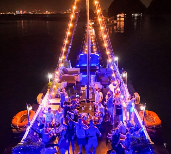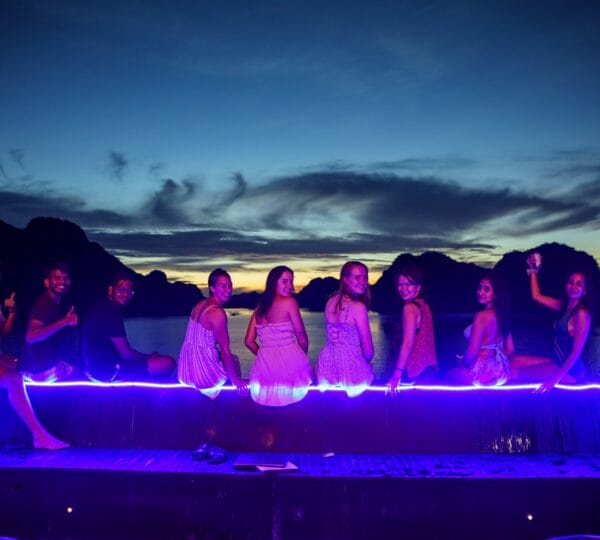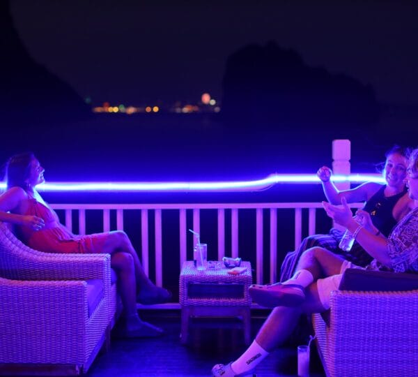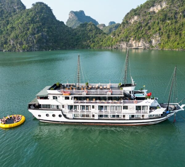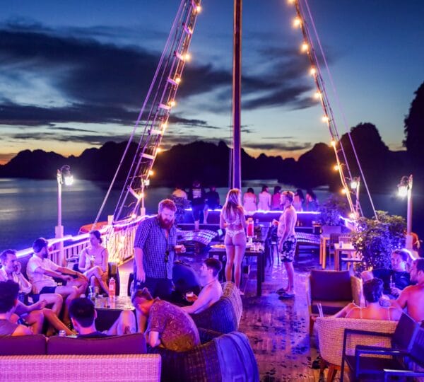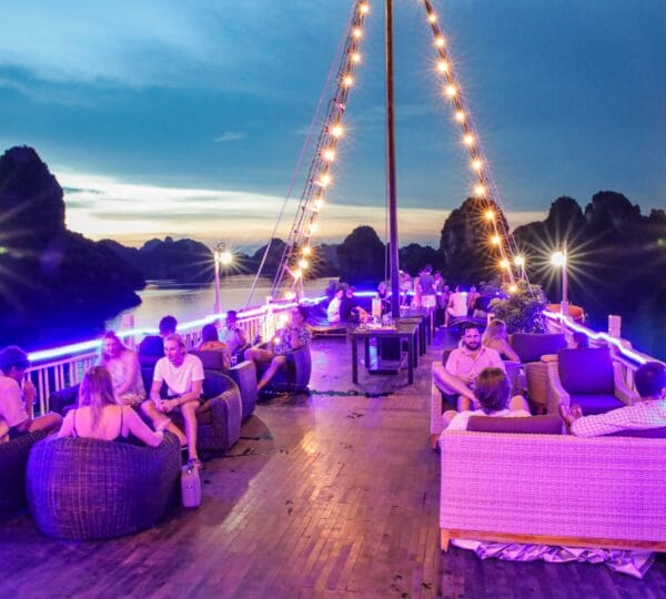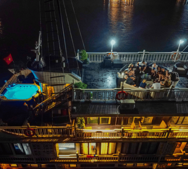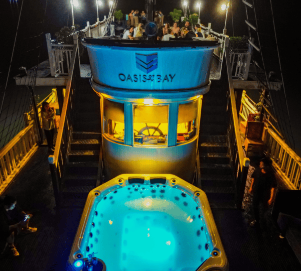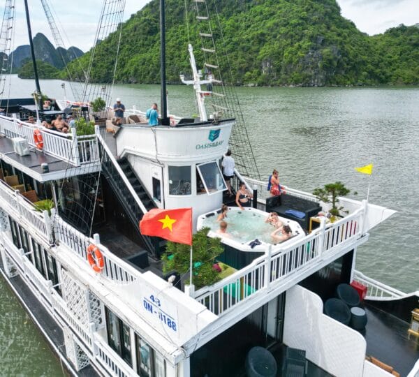 Guests on the Oasis Bay Party Cruise can explore some of the most tranquil areas of Ha Long Bay. Engage in kayaking and swimming in serene spots. For added fun and relaxation, enjoy activities such as bouncing on a giant trampoline or unwinding in the jacuzzi, which is strategically arranged around the cruise to provide panoramic views of the bay.