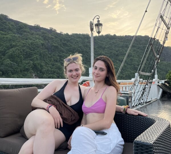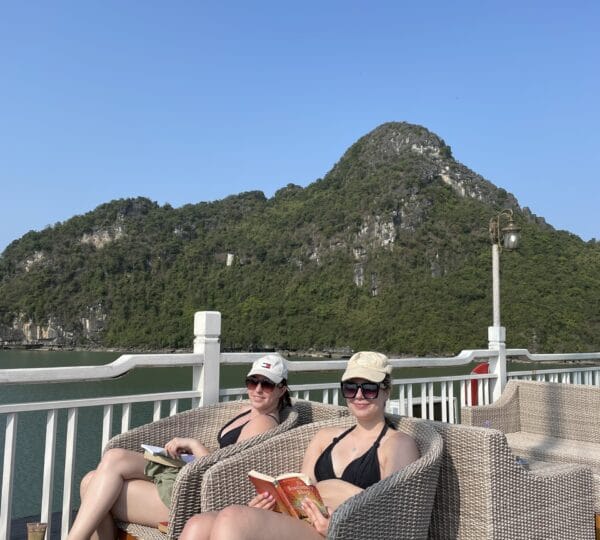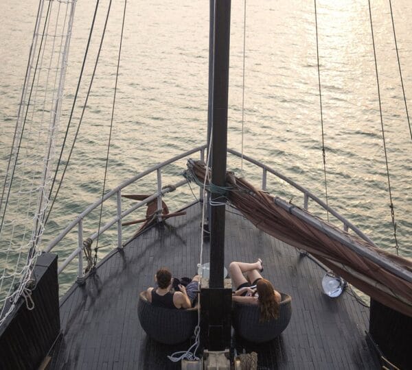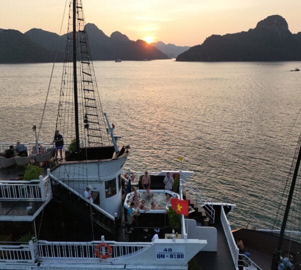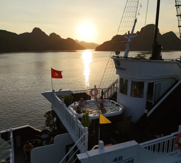 15:30-17:30 The cruise will bring you to the most traquil area of Halong Bay, getting away from the crowd where you can do somersault, backflip, kayak or take a dive. To top off, we also have a giant trampoline and many jacuzzis arranged around the cruise.