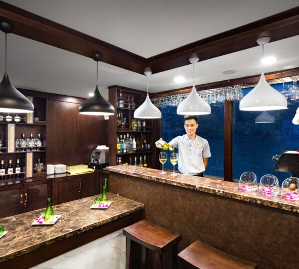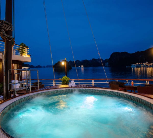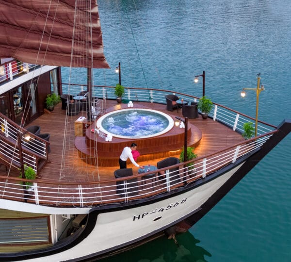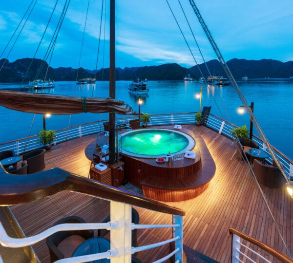 16:00-16:30 Return to Orchid Cruises. Guests may join a cooking class, take a swim at the untouched area, or enjoy the Happy Hour (buy 1 get 1) at the bar while watching the magnificent sunset over the Gulf of Tonkin.