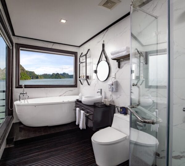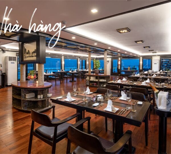 The cruise features 20 luxurious and elegantly appointed cabins, each equipped with a private balcony to fully enjoy the breathtaking views of Halong Bay and Lan Ha Bay. Cabins range from 28 to 56 square meters, providing ample space and comfort.
