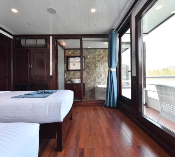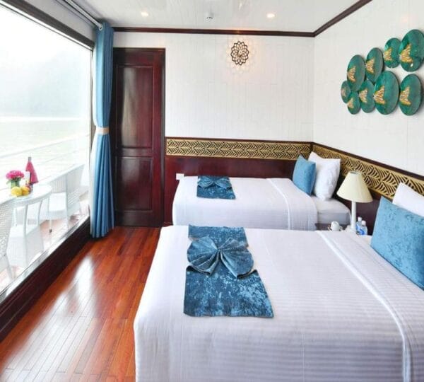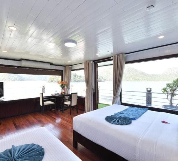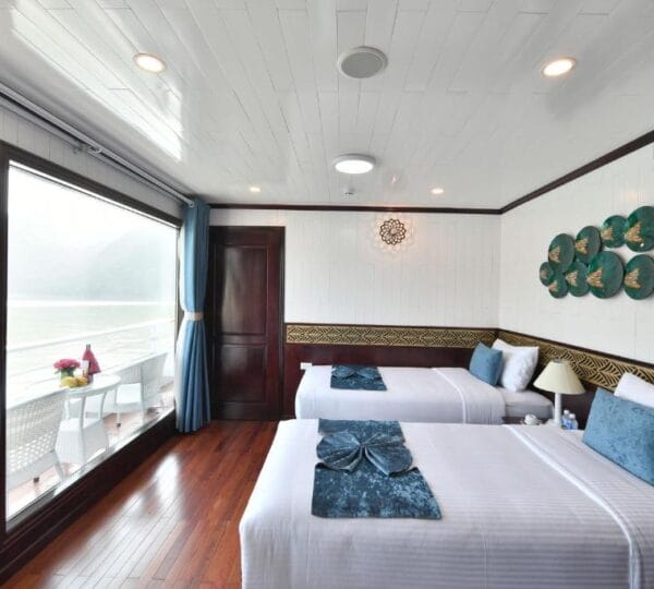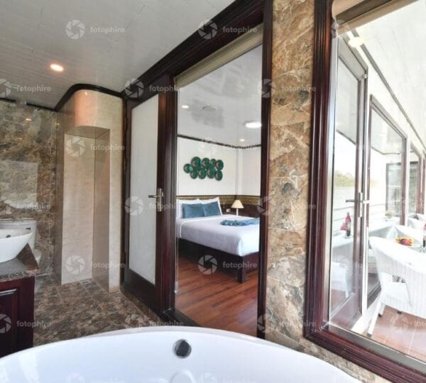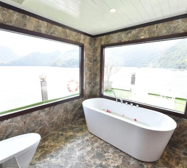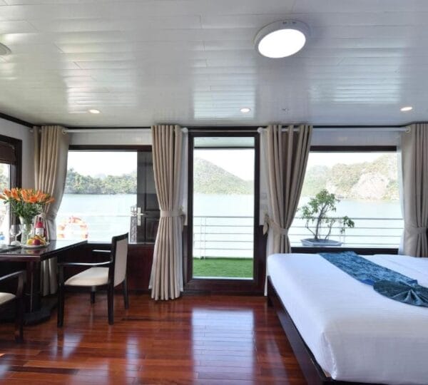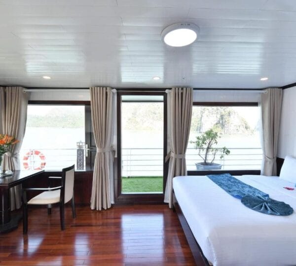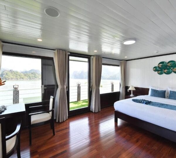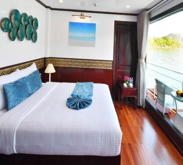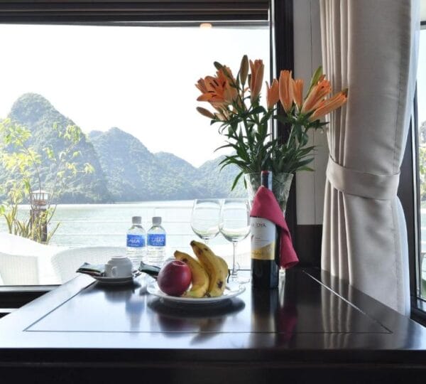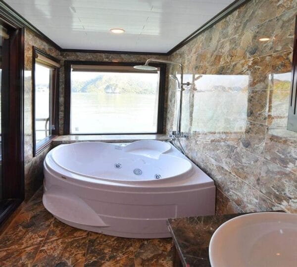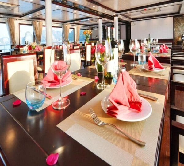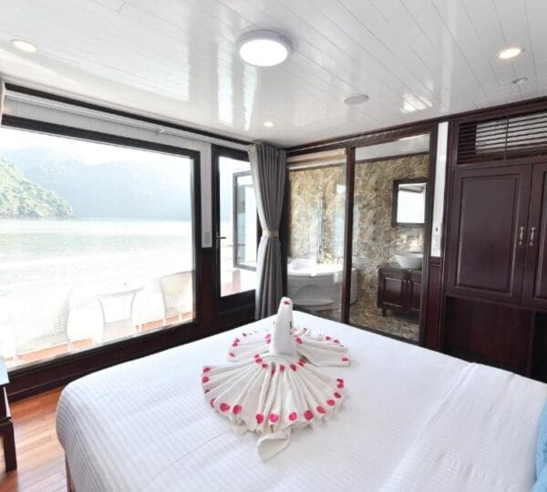 The cruise features 21 modern cabins, each thoughtfully designed with cozy and neatly arranged interiors, measuring between 18 to 22 sqm. Every cabin is equipped with a private balcony, providing a personal outdoor space to take in the breathtaking views of Lan Ha Bay. Additionally, 19 of the 21 cabins come with a private jacuzzi bathtub, allowing guests to enjoy moments of relaxation while admiring the natural beauty surrounding them.