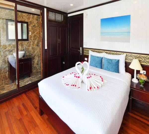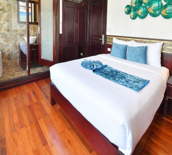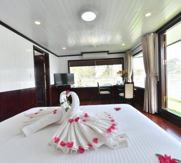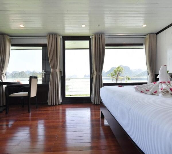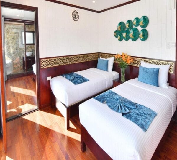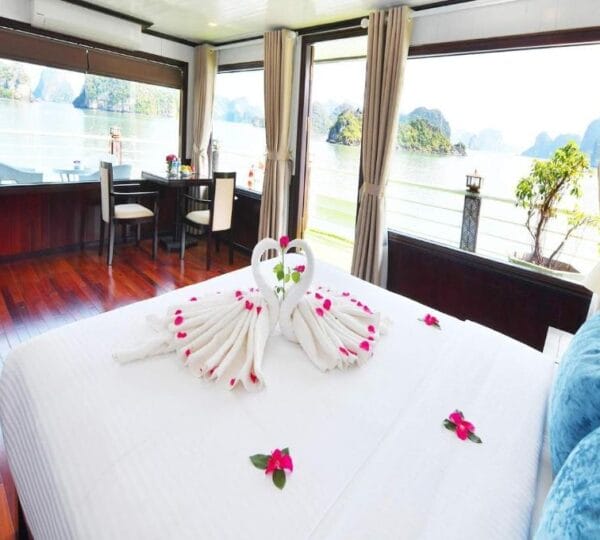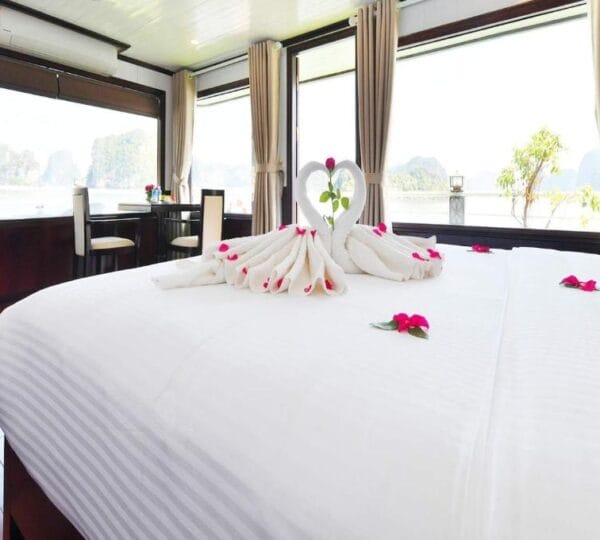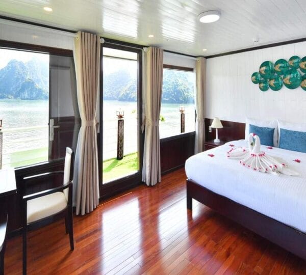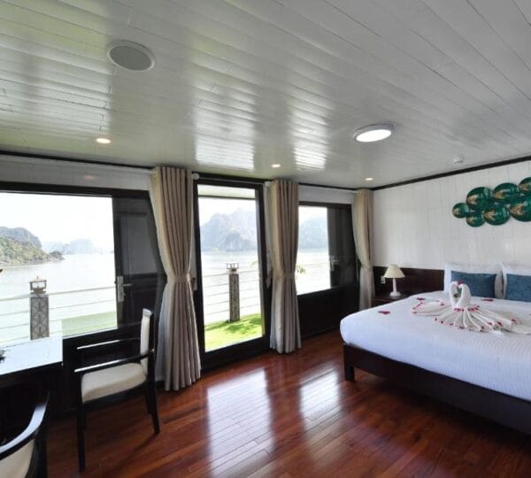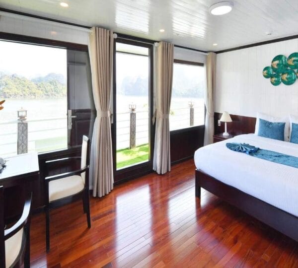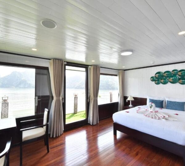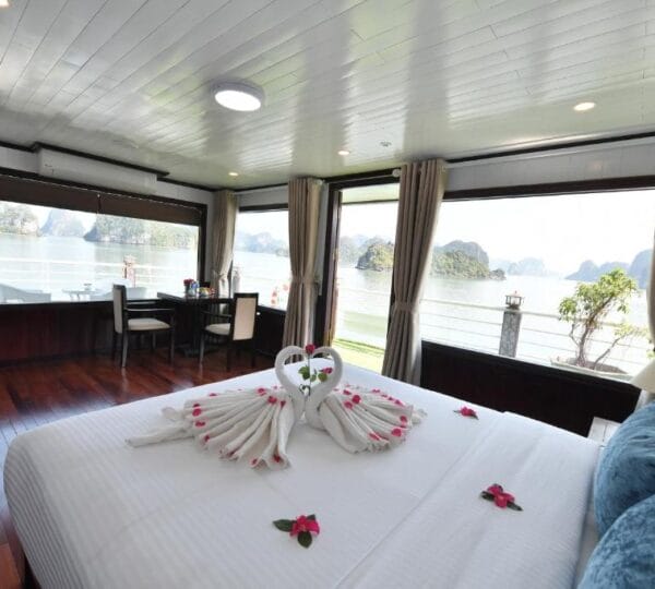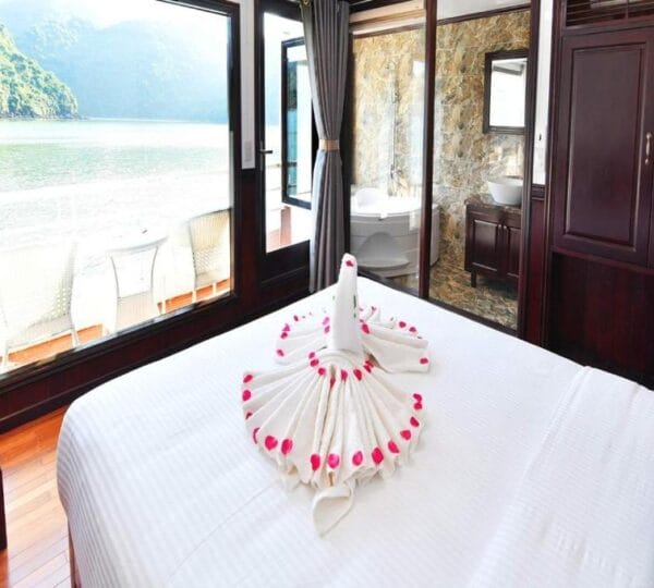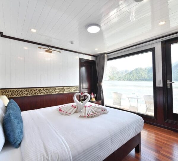 The cruise features 21 modern cabins, each thoughtfully designed with cozy and neatly arranged interiors, measuring between 18 to 22 sqm. Every cabin is equipped with a private balcony, providing a personal outdoor space to take in the breathtaking views of Lan Ha Bay. Additionally, 19 of the 21 cabins come with a private jacuzzi bathtub, allowing guests to enjoy moments of relaxation while admiring the natural beauty surrounding them.