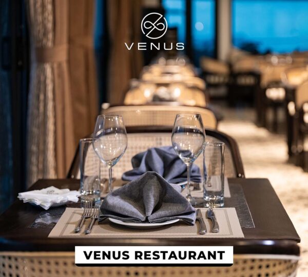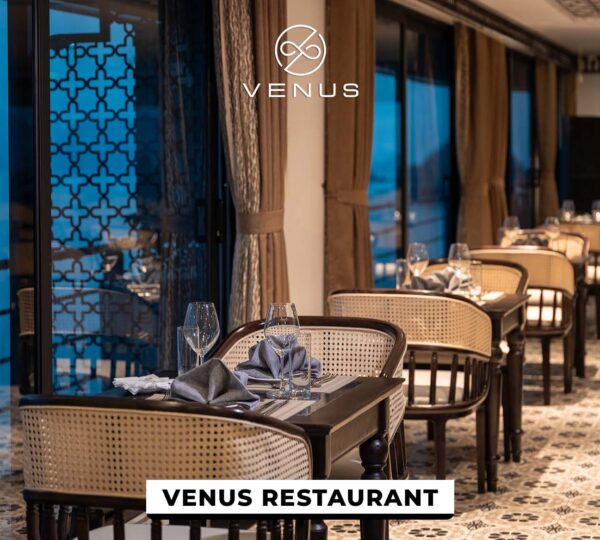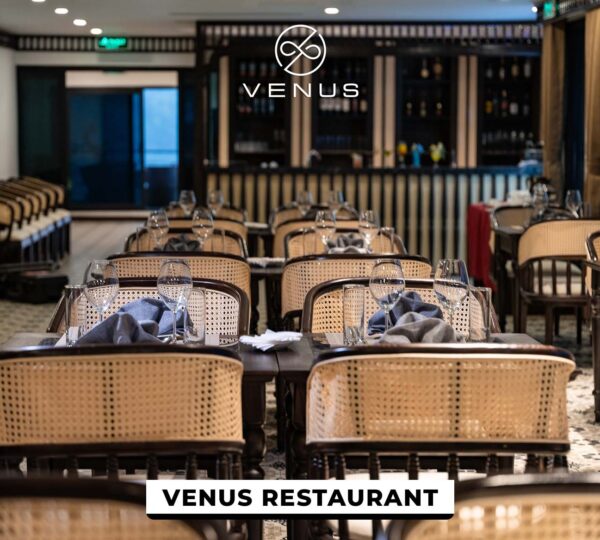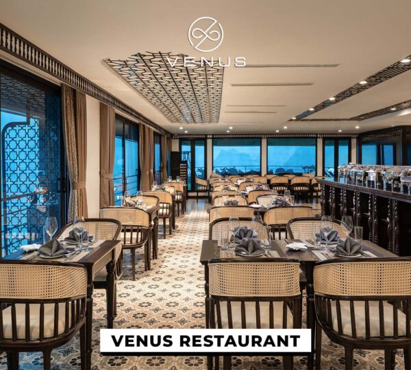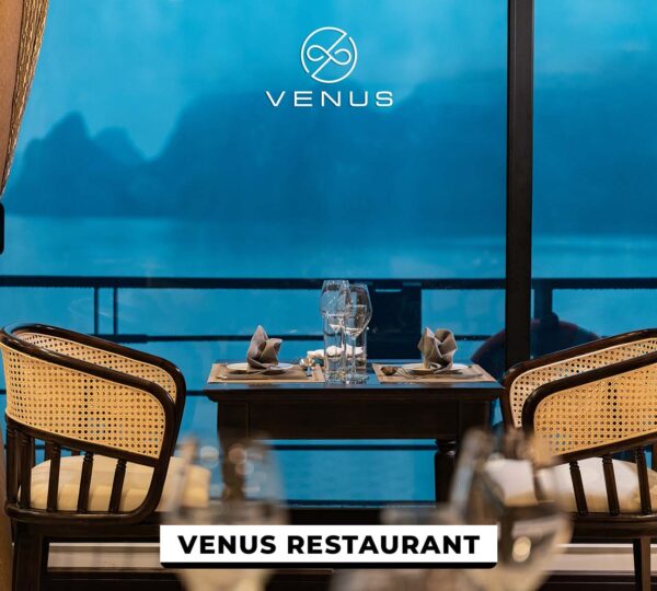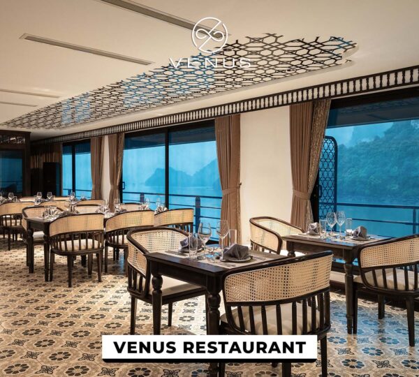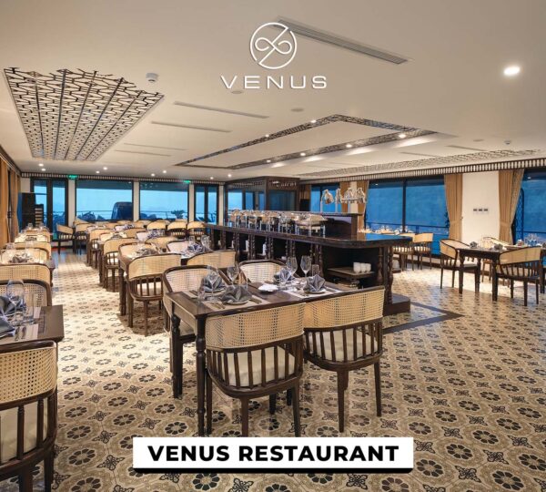 Onboard dining is a highlight of the Venus Cruise experience. The panoramic restaurant and bar present a refined culinary journey, showcasing an inspired blend of Vietnamese delicacies and international cuisine.